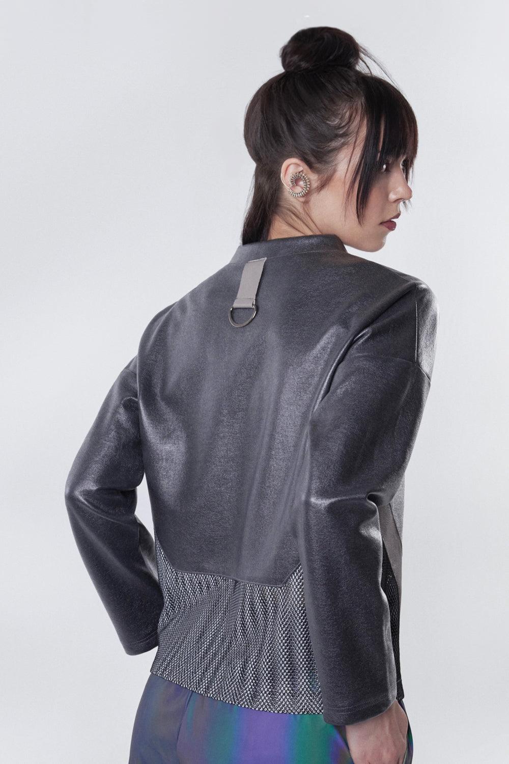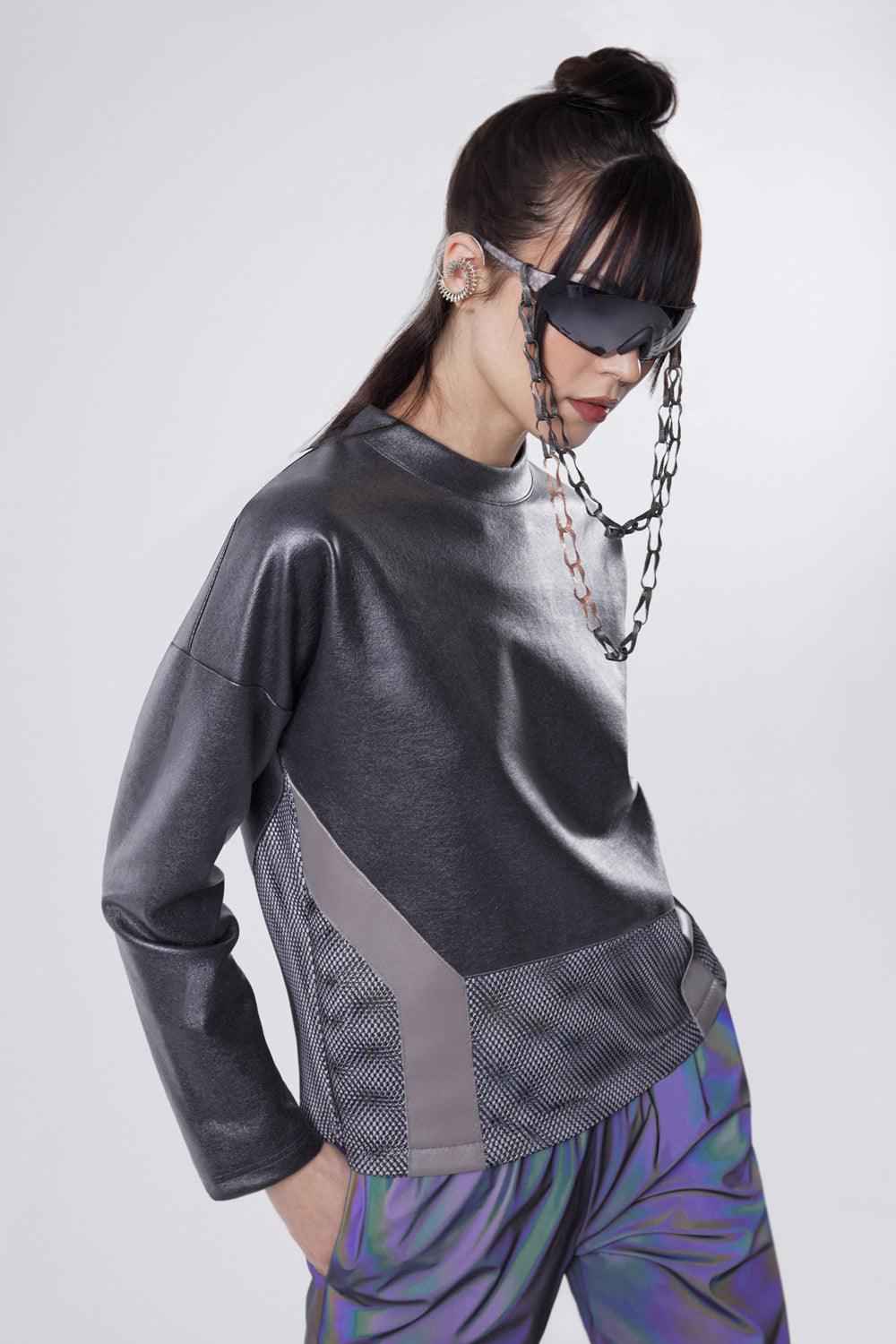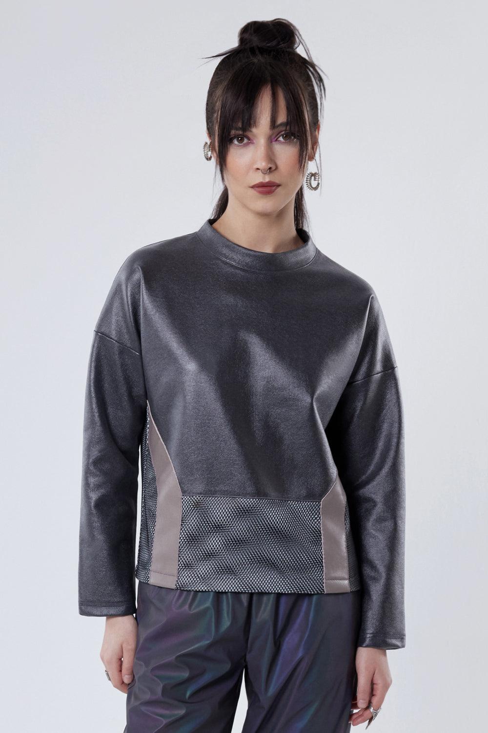 Hakiki deri ve file detaylı metalik kazak.