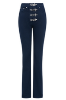 Modern ve şık tasarımıyla öne çıkan yüksek bel, silver aksesuar detaylı, paçasında yırtmaç detaylı denim pantolon, günlük ve özel kombinleriniz için ideal bir seçenektir. Yumuşak kumaşı sayesinde konforlu ve rahat bir kullanım sunar. Tam kalıp kesimi feminen siluetinizi ön plana çıkarır.