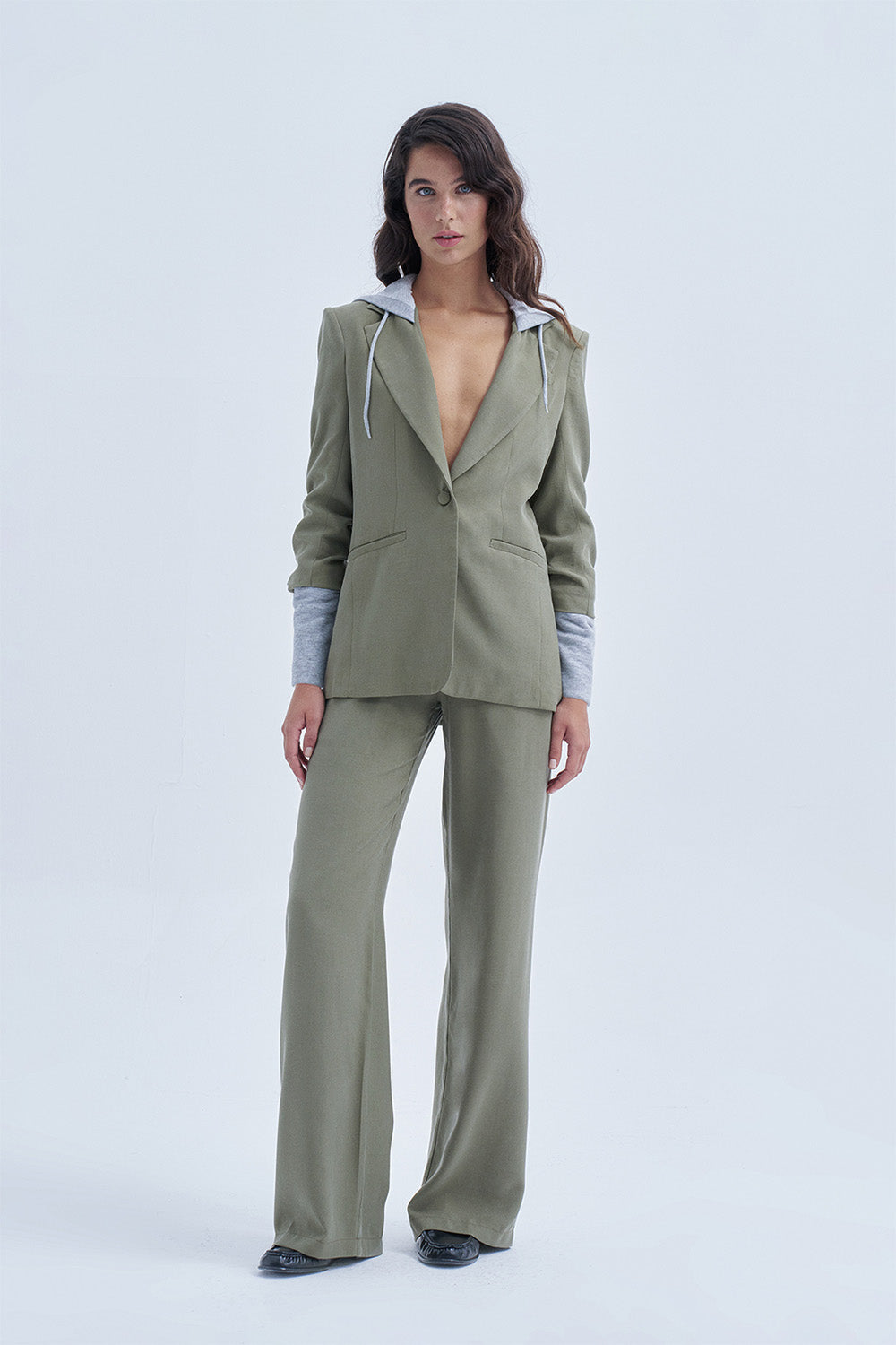Haki Renk, Belde Gri Örme Lastikli İp Detaylı, Yüksek Bel, Geniş Paçalı Pantolon
