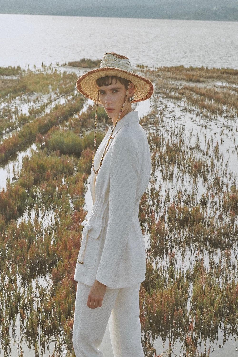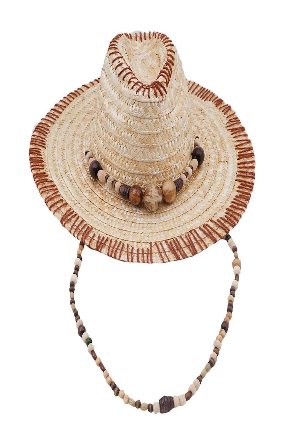 Jeremi, renkli ip süslemeli ve doğal boncuklarla tasarlanmış hasır şapka.