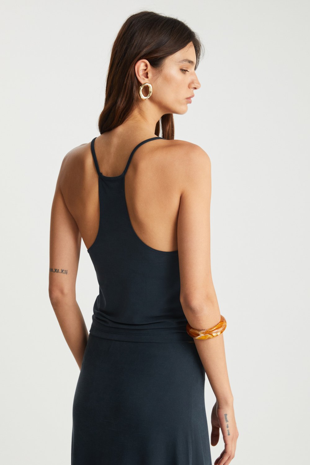 Slim, askılı ve racer sırtlı, boyundan bağlı ince askılı üst. Ağırlıklı olarak Modal kumaş kullanılarak üretilmiştir.