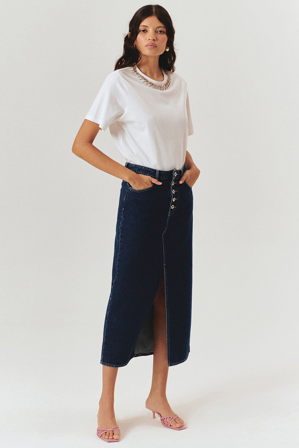 Bu beyaz pamuklu örme t-shirt, bisiklet yaka tasarımıyla günlük şıklığa zarif bir dokunuş katıyor. Yaka kısmında yer alan detaylı işlemeler, tasarıma sofistike bir hava kazandırırken, klasik beyaz rengiyle her kombinle kolayca uyum sağlar. Rahat kesimi sayesinde hareket özgürlüğü sunan bu t-shirt, hem şık hem de konforlu bir seçenek olarak öne çıkıyor.