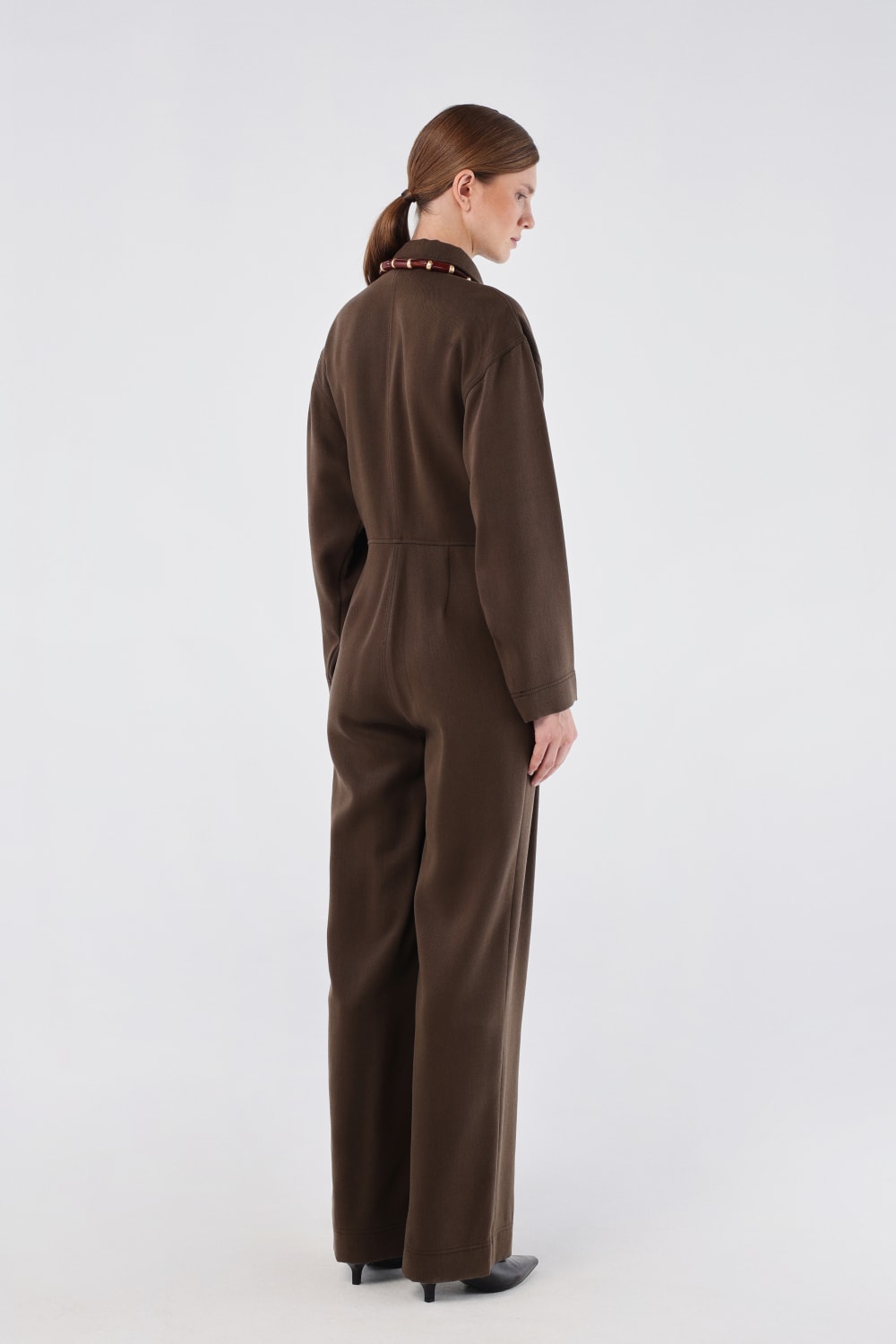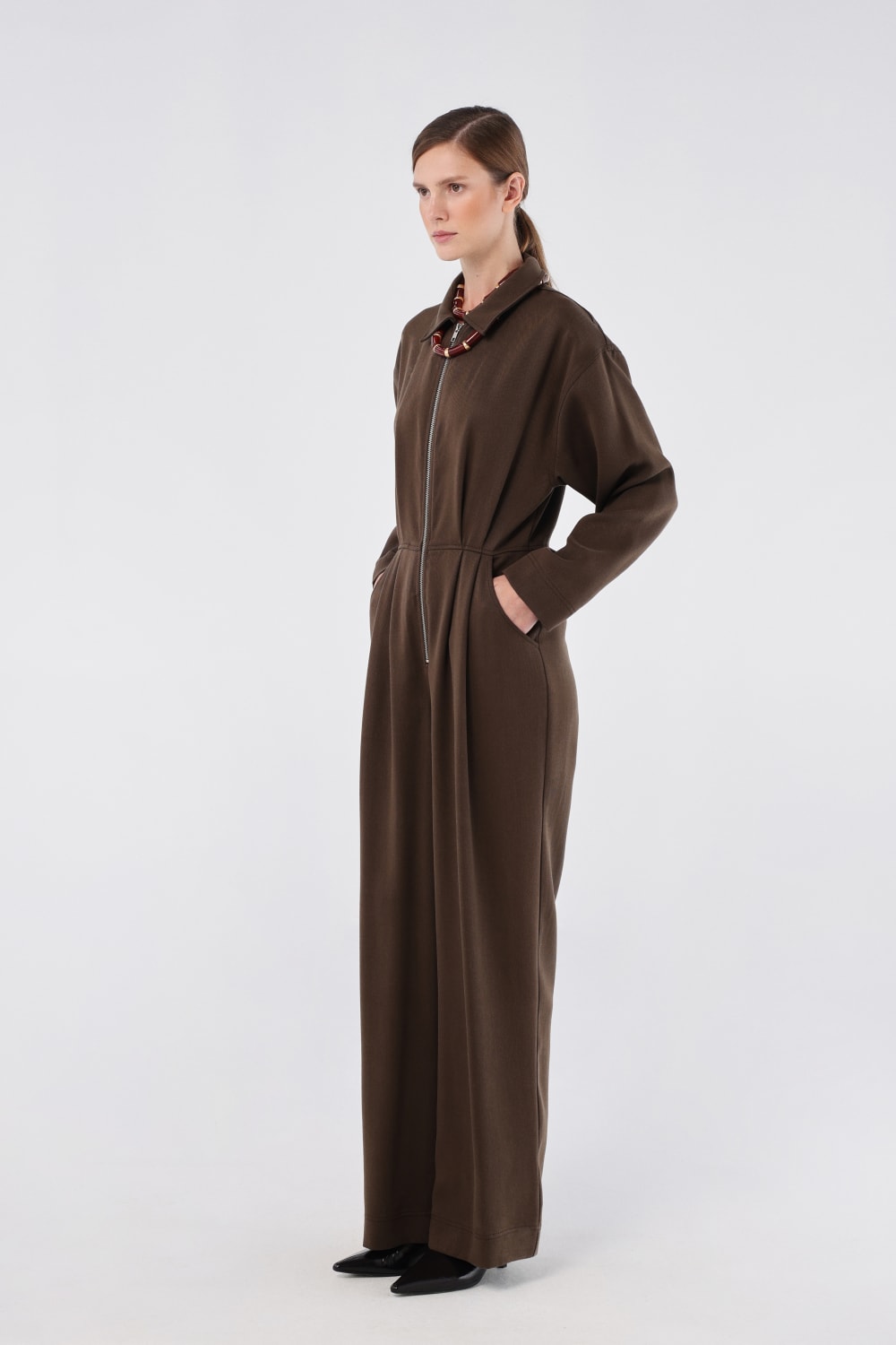 Doğadan ilham alan, %100 TENCEL™ Lyocell kumaştan üretilmiş bu tulum, hem yumuşak hem de nefes alabilen dokusuyla gün boyu rahatlık sağlar. Önden fermuarlı kapama, zahmetsiz bir kullanım sunarken, klasik yaka tasarımı şıklık katar.
