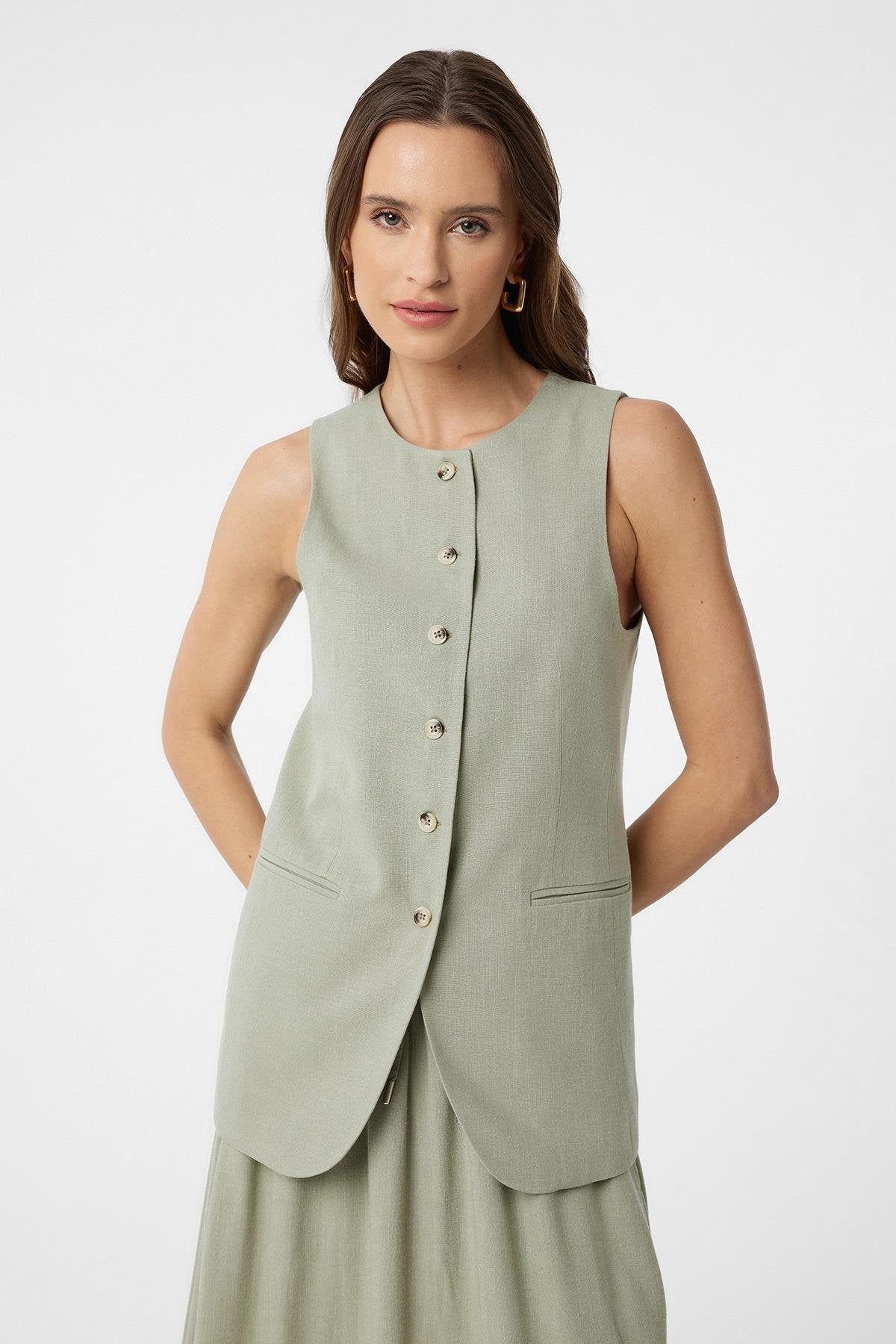 Haki Keten Karışımlı Kadın Uzun Yelek