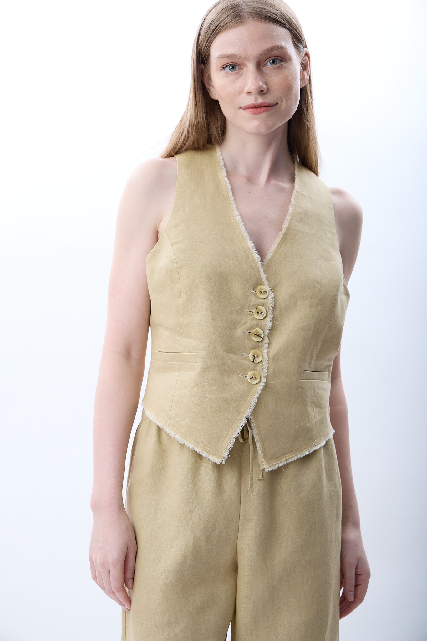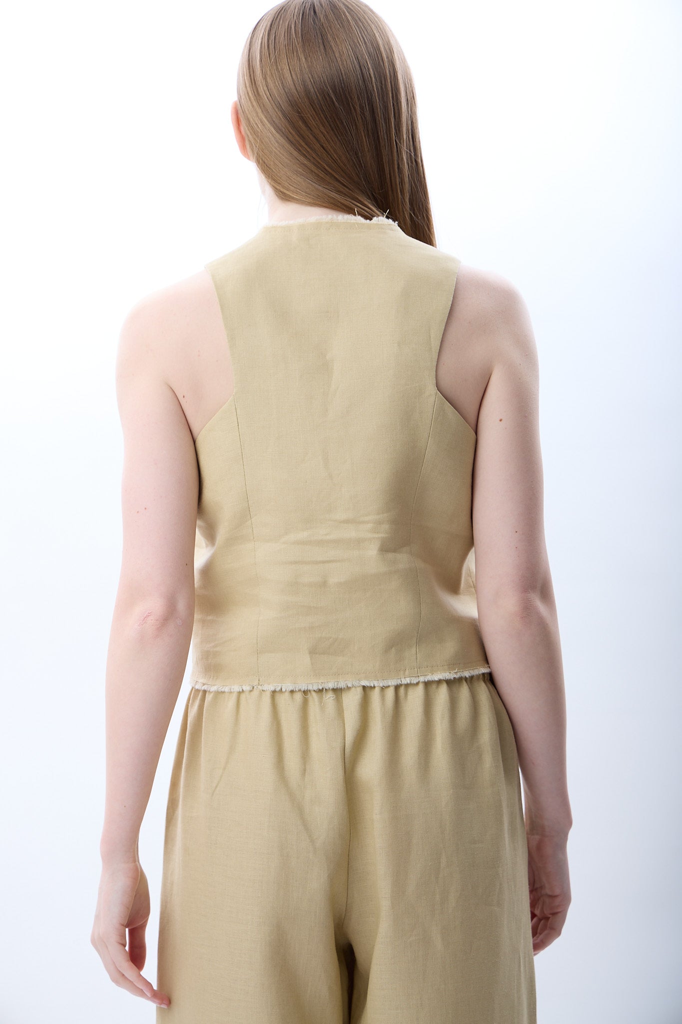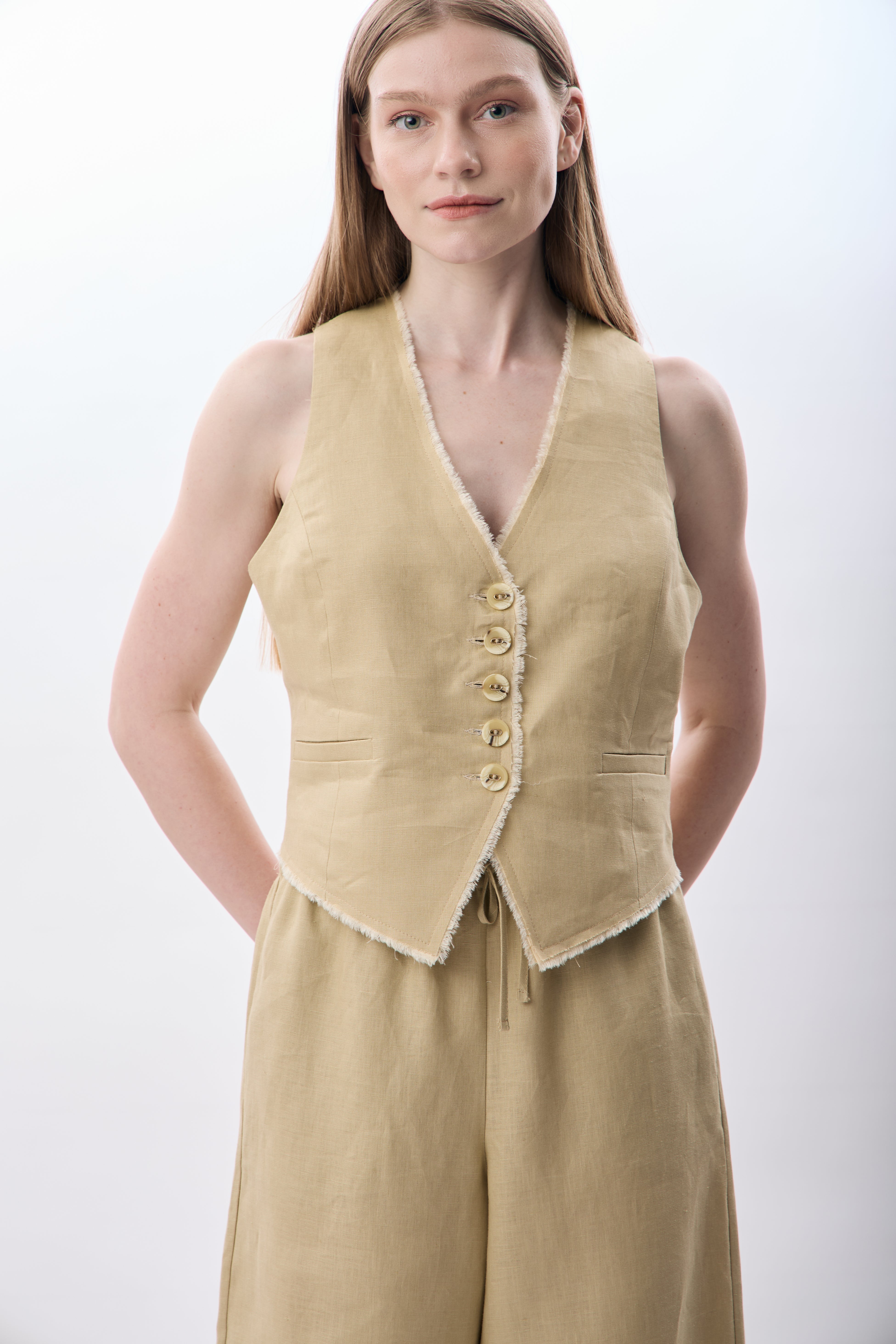 Düğmeli Keten Kolsuz Yelek (Bej)