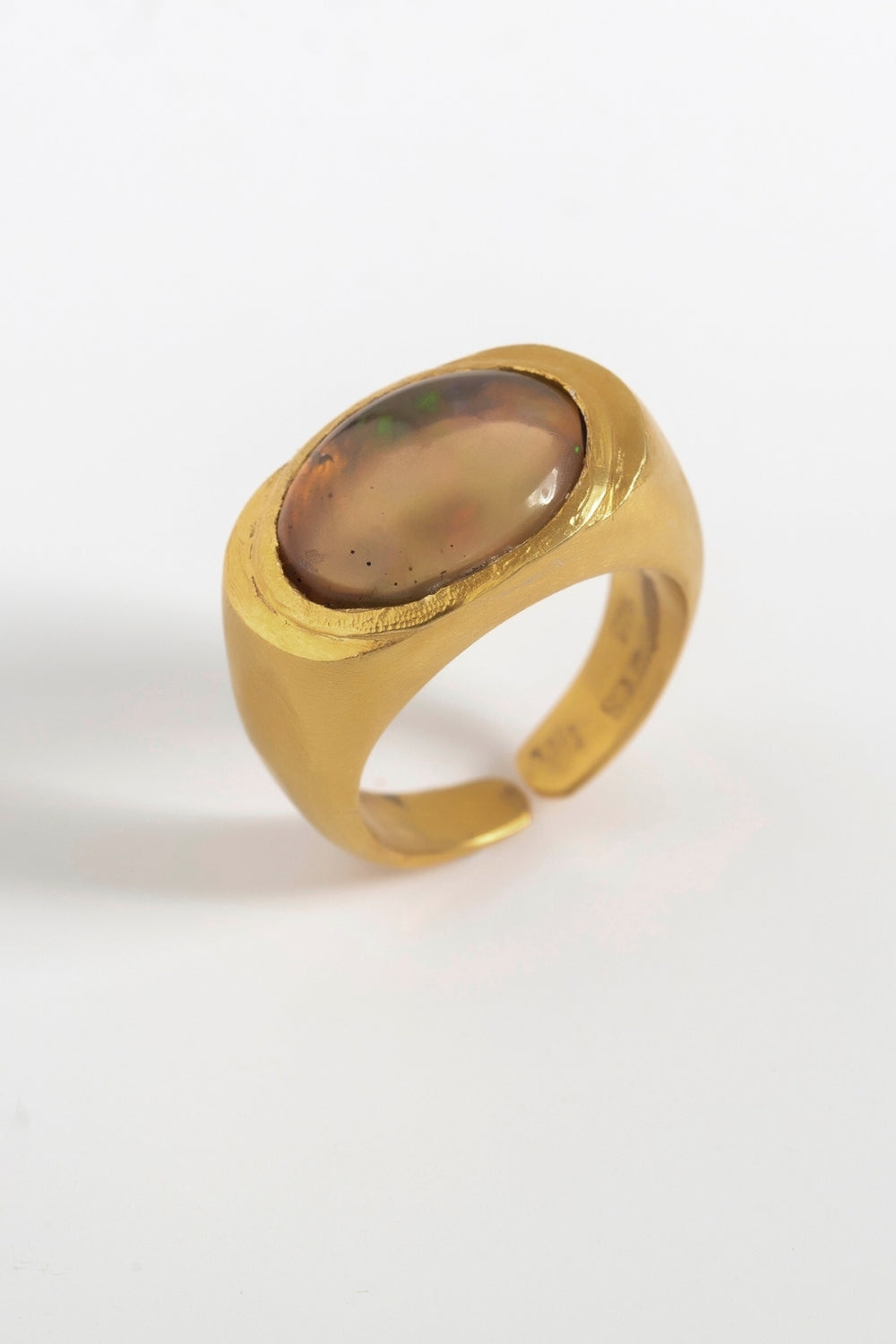 Roman Signet Yüzüğü, geri dönüştürülmüş 925 ayar gümüşten üretilmiş, 24 ayar altın kaplamalı bir tasarımdır. Tamamen el yapımıdır ve siyah opal ile süslenmiştir.