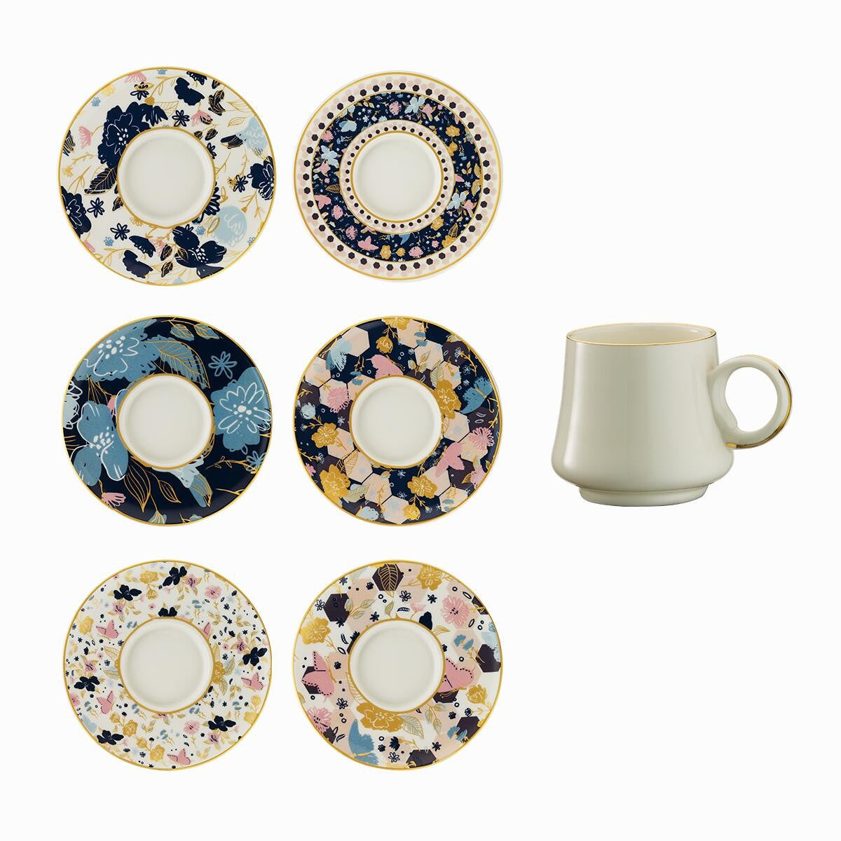 Sandro Moreno 1453 Potpuri Double Yüzük Gold kahve fincan takımı, zarif tasarımı ve gold detaylarıyla kahve sunumlarınıza şıklık katar. “Karma” koleksiyonuna ait bu özel seri, dört elementin uyumundan ilham alan sanatsal tasarımıyla hem modern hem de estetik bir görünüm sunar.
