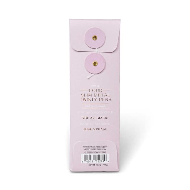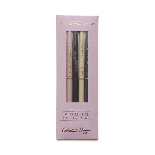 Design Works Ink Twisty Slim 4’lü Tükenmez Kalem Seti – Celestial, ince metal gövdesi ve ilham veren detaylarıyla yazma deneyimini keyifli bir ritüele dönüştürür. Zarif formu ve akıcı yazımı sayesinde not alırken, yapılacaklar listesi oluştururken ya da günlük tutarken gün boyu konforlu bir kullanım sunar.