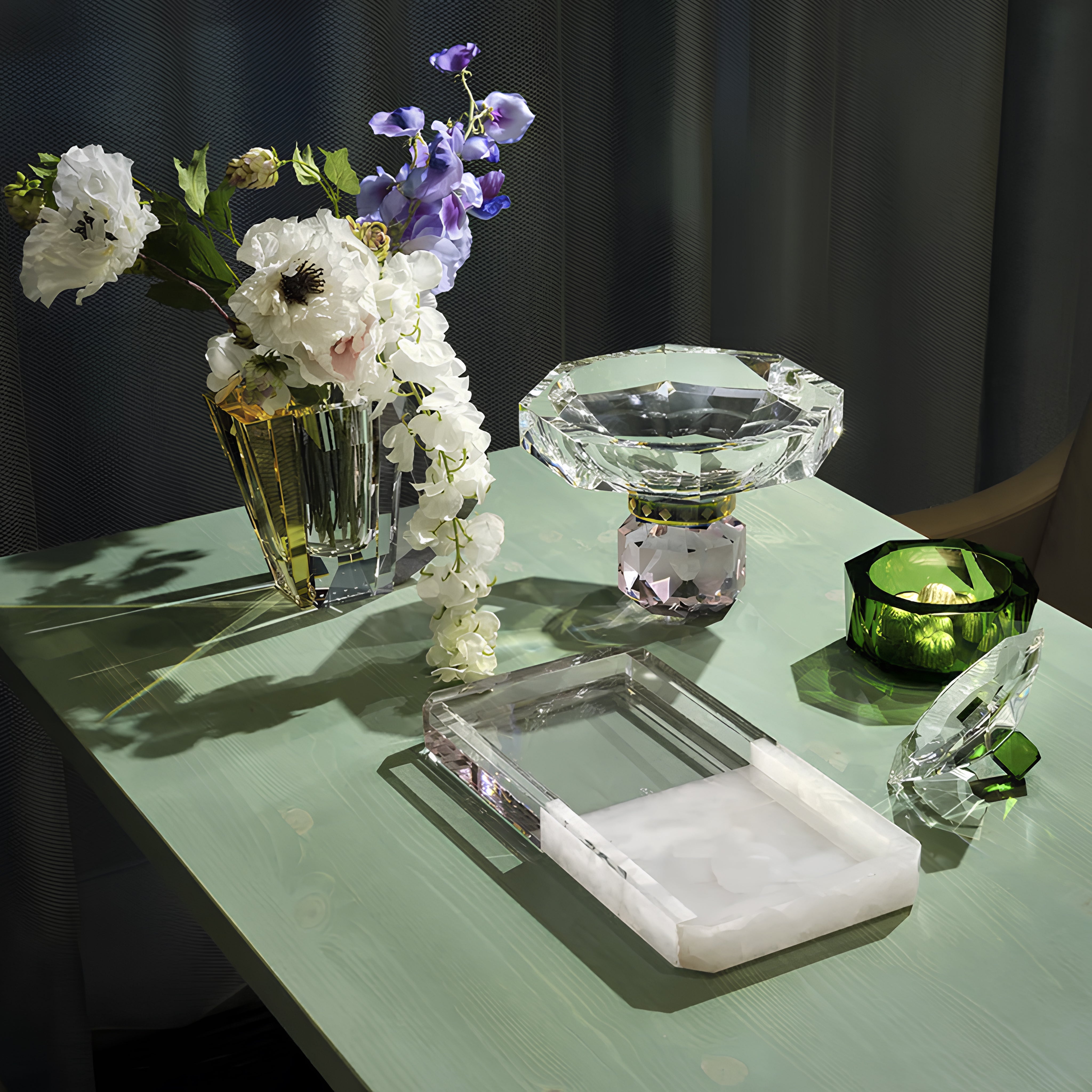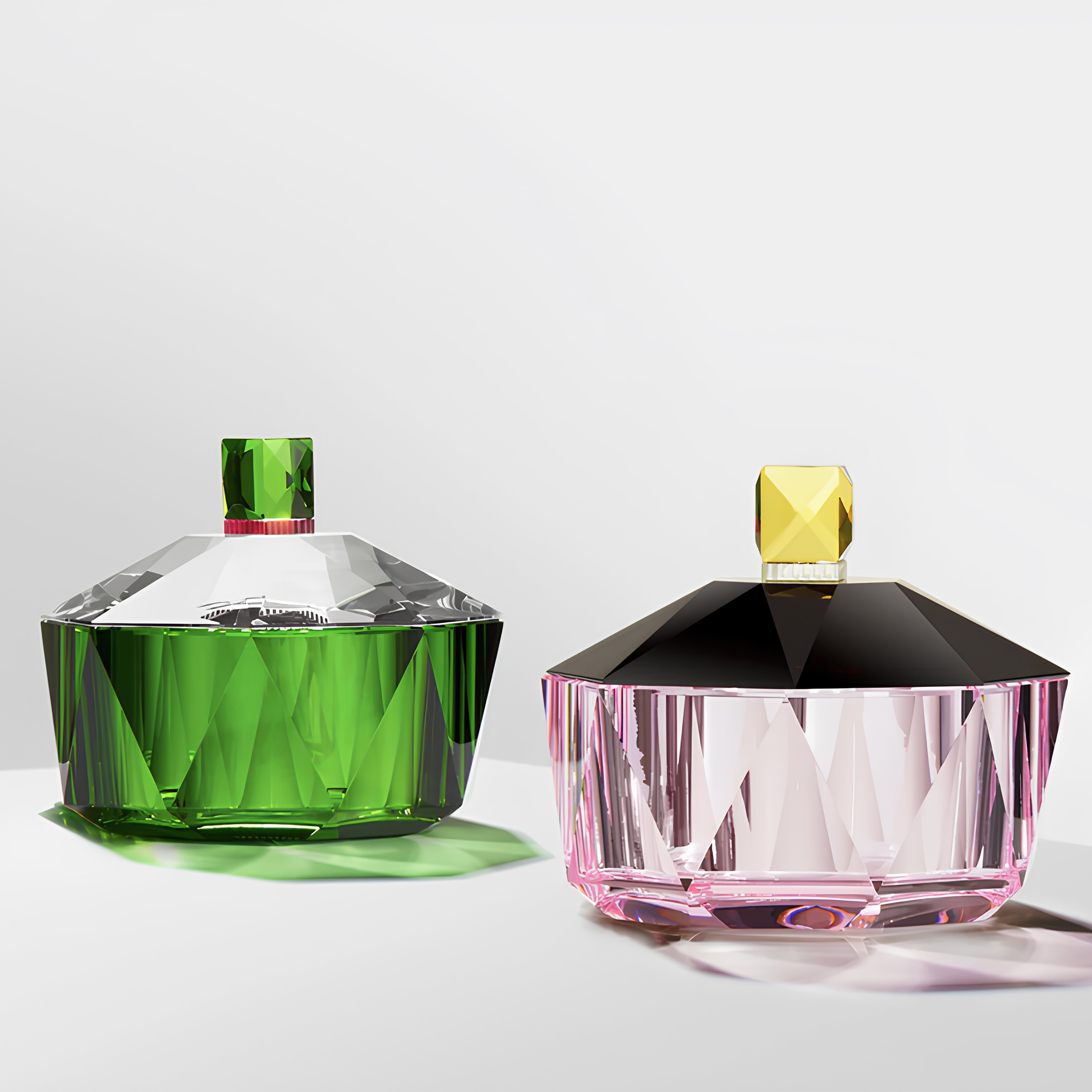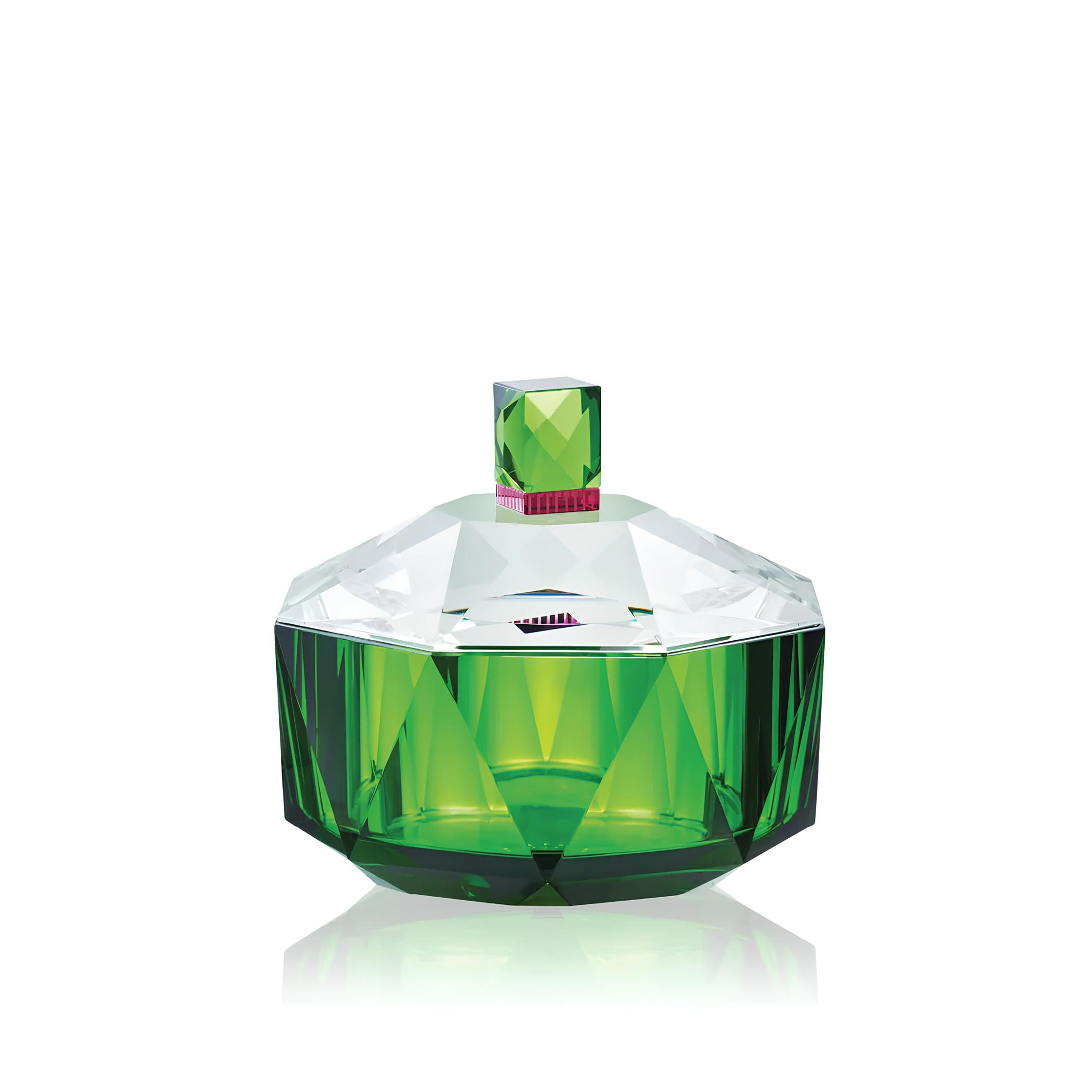 Bu gösterişli yeşil saklama kavanozu, kristalden üretilmiş olup sekizgen bir kapağa sahiptir. Romantik ama cesur renk kombinasyonu sayesinde bulunduğu her ortama canlılık katar. Makyaj masası, çalışma masası veya sehpa üzerinde sergilemek için ideal olan bu şık kase; mücevher, anahtar veya küçük aksesuarları saklamak için kullanılabilir. Ayrıca, Reflections Copenhagen’ın diğer zarif şekerlikleriyle kombinleyebilir veya ışıltılı tepsilerimizden biri üzerinde sergileyebilirsiniz.
