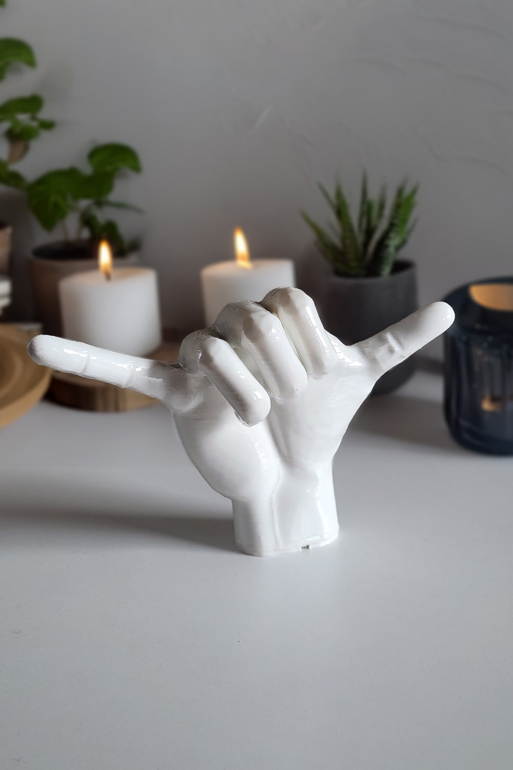 Bu özel biopolimerden üretilmiş Shaka el figürü, rahatlık ve pozitif enerjiyi simgeleyen tasarımıyla dikkat çekiyor. 11 cm yüksekliğindeki bu heykel, evinizde farklılık yaratmak ve anlamlı bir atmosfer oluşturmak isteyenler için ideal bir dekoratif aksesuar. Hem çevre dostu hem de modern bir tasarımla evinizi süsleyin