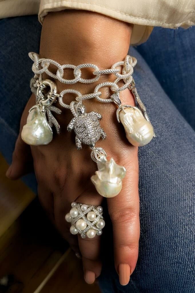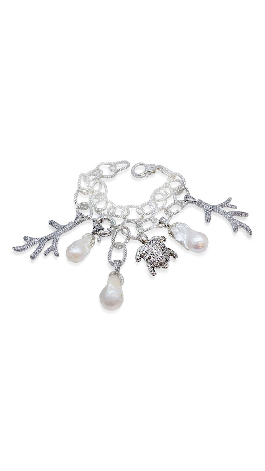 TEMIS 925 Ayar Gümüş İnci Bileklik, doğal dünyanın sükuneti ve zarafetini bileğinize taşıyor. İki sıra halinde 925 ayar gümüş kaplamalı pirinç zincirler, bu bilekliğin temelini oluştururken, üzerlerine yerleştirilmiş detaylı kaplumbağa ve dal figürleri ile doğanın bir parçası gibi hissetmenizi sağlar. Her bir barok inci, kusursuzluğun kusursuz olmayan güzelliğini temsil eder ve bilekliğe benzersiz bir karakter kazandırır. TEMIS 925 Ayar Gümüş Bileklik, denizin ve toprağın öğelerini bir araya getirerek, takan kişiye doğal bir şıklık sunar.