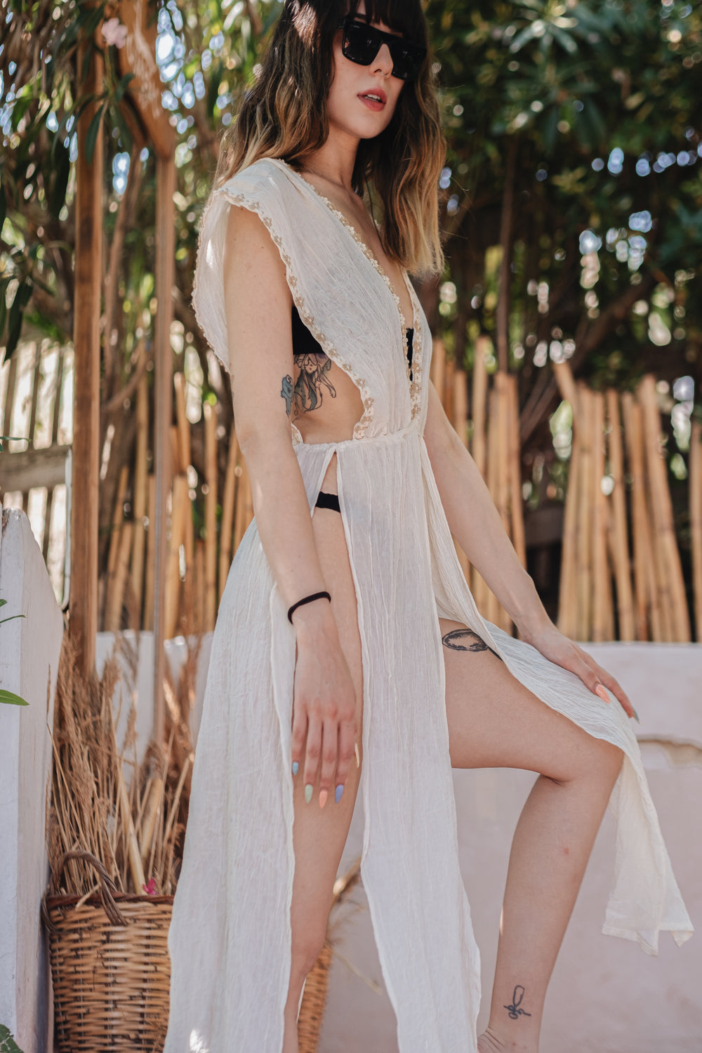 Bol kesim ve bohem tarzıyla hareket özgürlüğü sunan bu maksi elbise, yaz gardırobunuzun vazgeçilmezi olacak. Ön ve arkadaki derin V-yaka ve V-sırt dekolteleri, yanlardan bele kadar uzanan dantelli şeritler ve dört yanındaki derin yırtmaçlar ile modern ve çekici bir görünüm sağlar.
