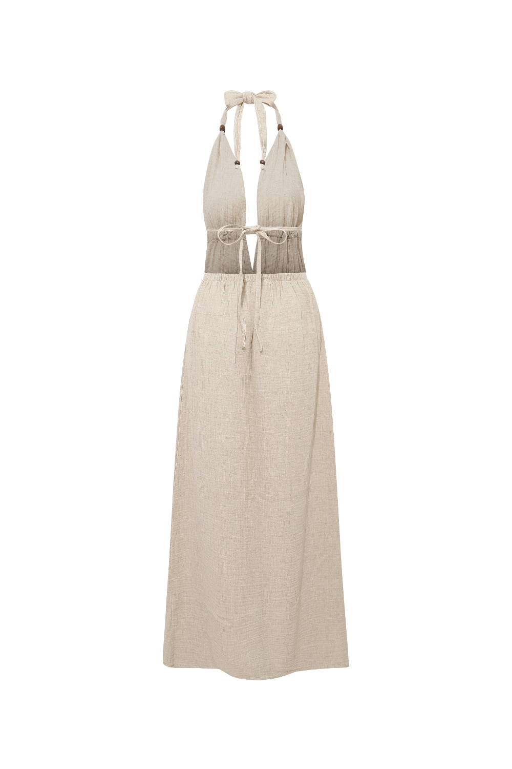 Boyundan Bağlamalı Uzun Keten Elbise%100 Keten,Cildi serin tutan, nefes alabilen yapısıyla yaz aylarının favorisi keten kumaş tercih edilmiştir,Uzun,boyundan bağlama ile tasarlanmış elbise, sırt ve göğüs dekoltesi ile şık bir görünüm sunmaktadır.BAKIM ÖNERİLERİ:30 derecede yıkama yapılabilir,Ağartıcı kullanılamaz,Makinede kurutmayınız.Bel: 60 cmBoy: 140 cm