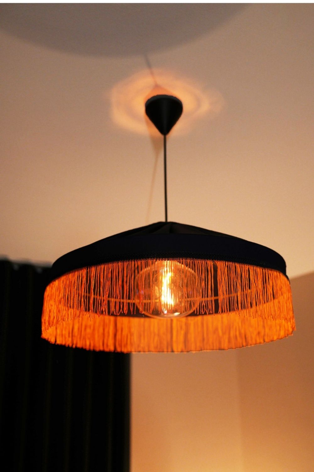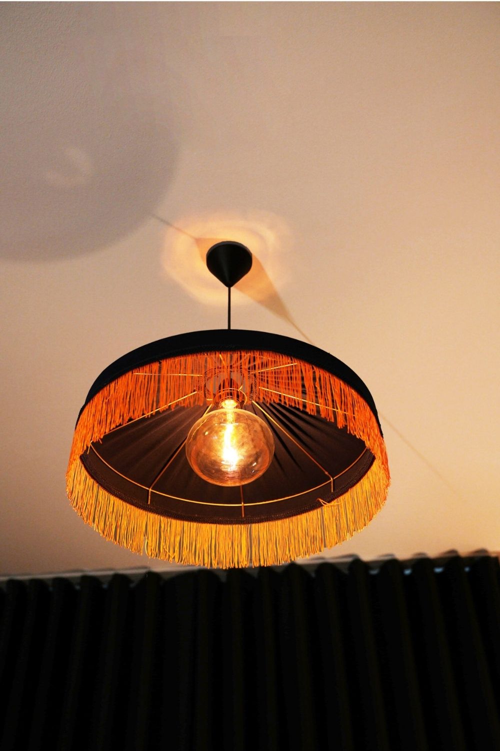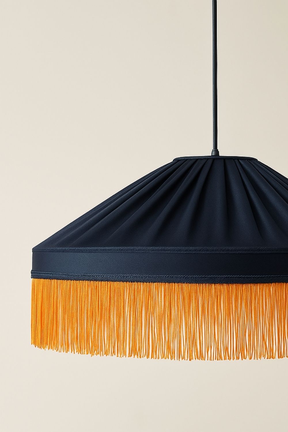 Ürün Bilgileri (Teknik Detaylar):Malzeme: Saten kumaş kaplama, el işçiliği püskül detayÇap: 45 cmRenk: Lacivert gövde, turuncu-altın püsküllerIşık: Amber tonlu LED ampul (geniş açılı, loş aydınlatma)Ampul Uyumu: E27 duy (retro büyük boy ampul önerilir)Kullanım Alanı: Yatak odası, loft daireler, butik oteller, sanat ve okuma köşeleri