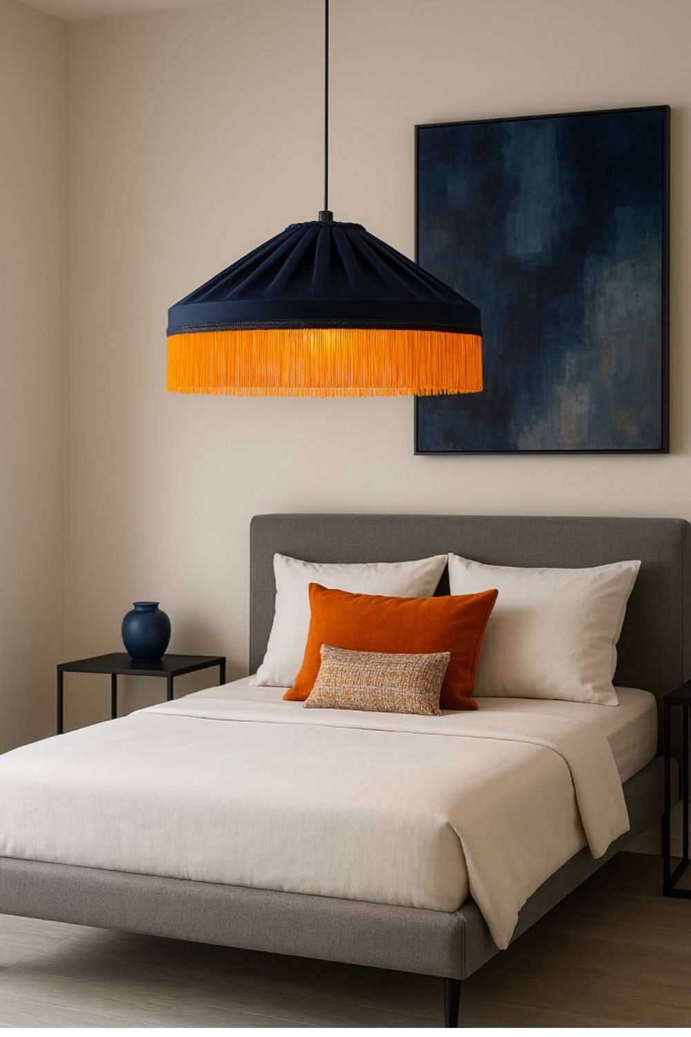 Lacivert saten kumaşı ve turuncu püskül detaylarıyla modern mekanların odak noktası olur.