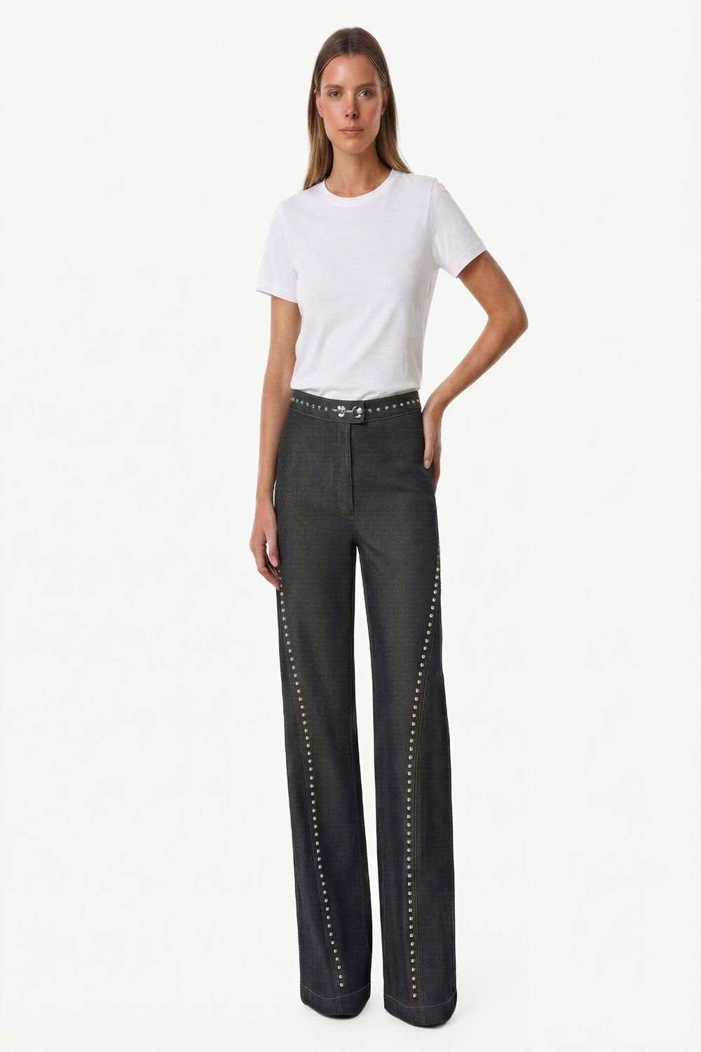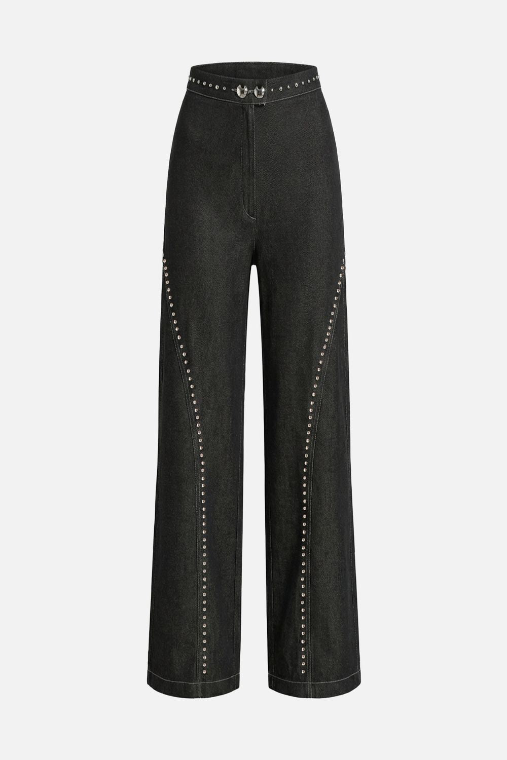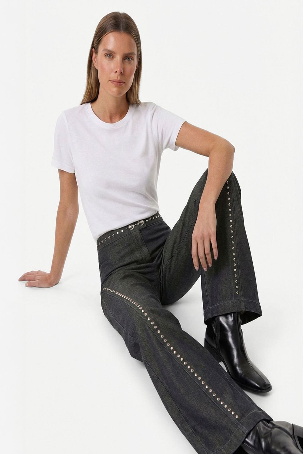 Amber şehirli takım kombinasyonunda, koyu lacivert denim; mokanın sıcak ve sofistike tonlarıyla buluşuyor. Geniş paça pantolonun yanlarında ve bel çevresinde uzanan çift sıra gümüş metal perçinler, her adımda ışığı yakalayarak tasarıma çarpıcı bir karakter kazandırıyor. Öne doğru dökümlü yapıya ve sırtı derin dekolteli bluzla tamamlanan bu kombin, güçlü bir denge kuruyor.