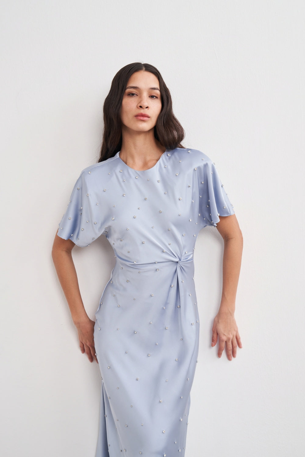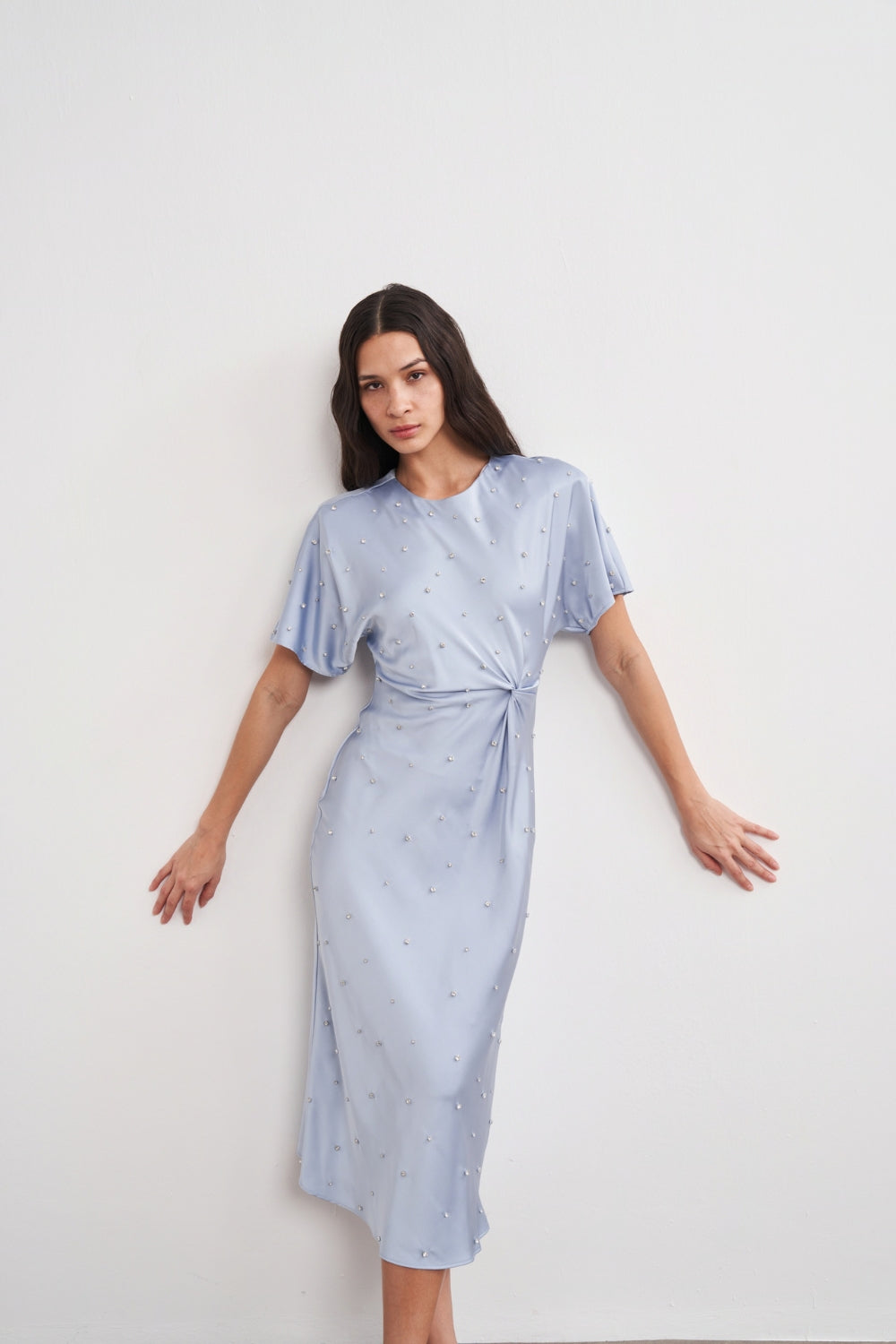 WINGCOTT Taş İşlemeli Bel Drapeli Midi Saten Elbise