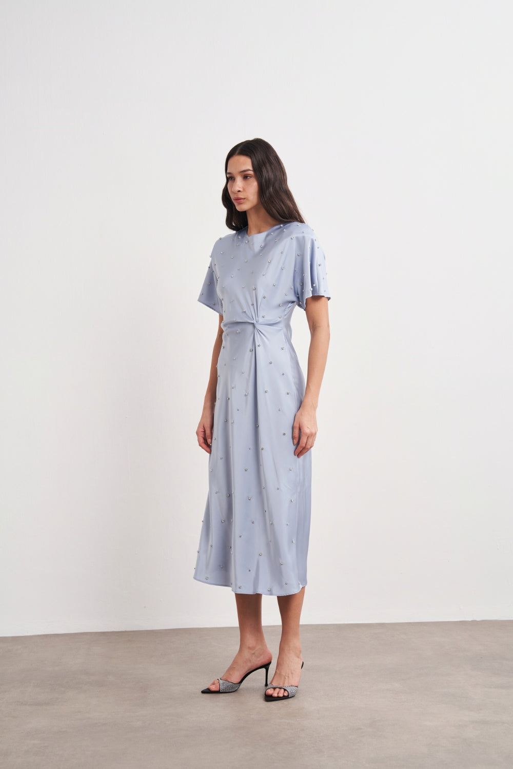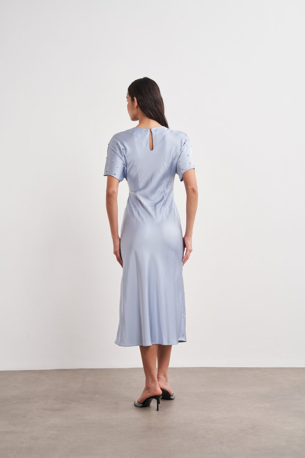 Taş İşlemeli Bel Drapeli Midi Saten Elbise