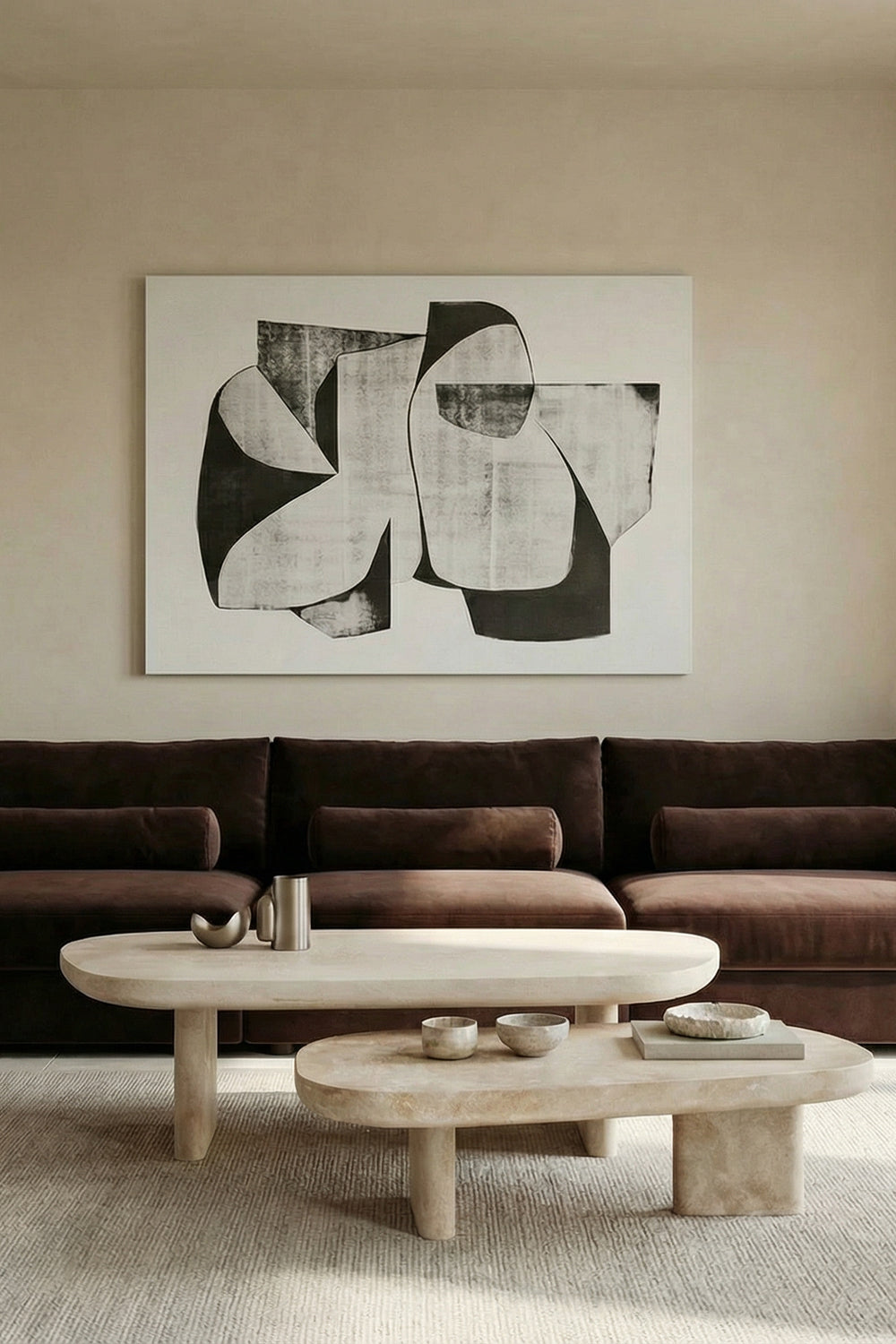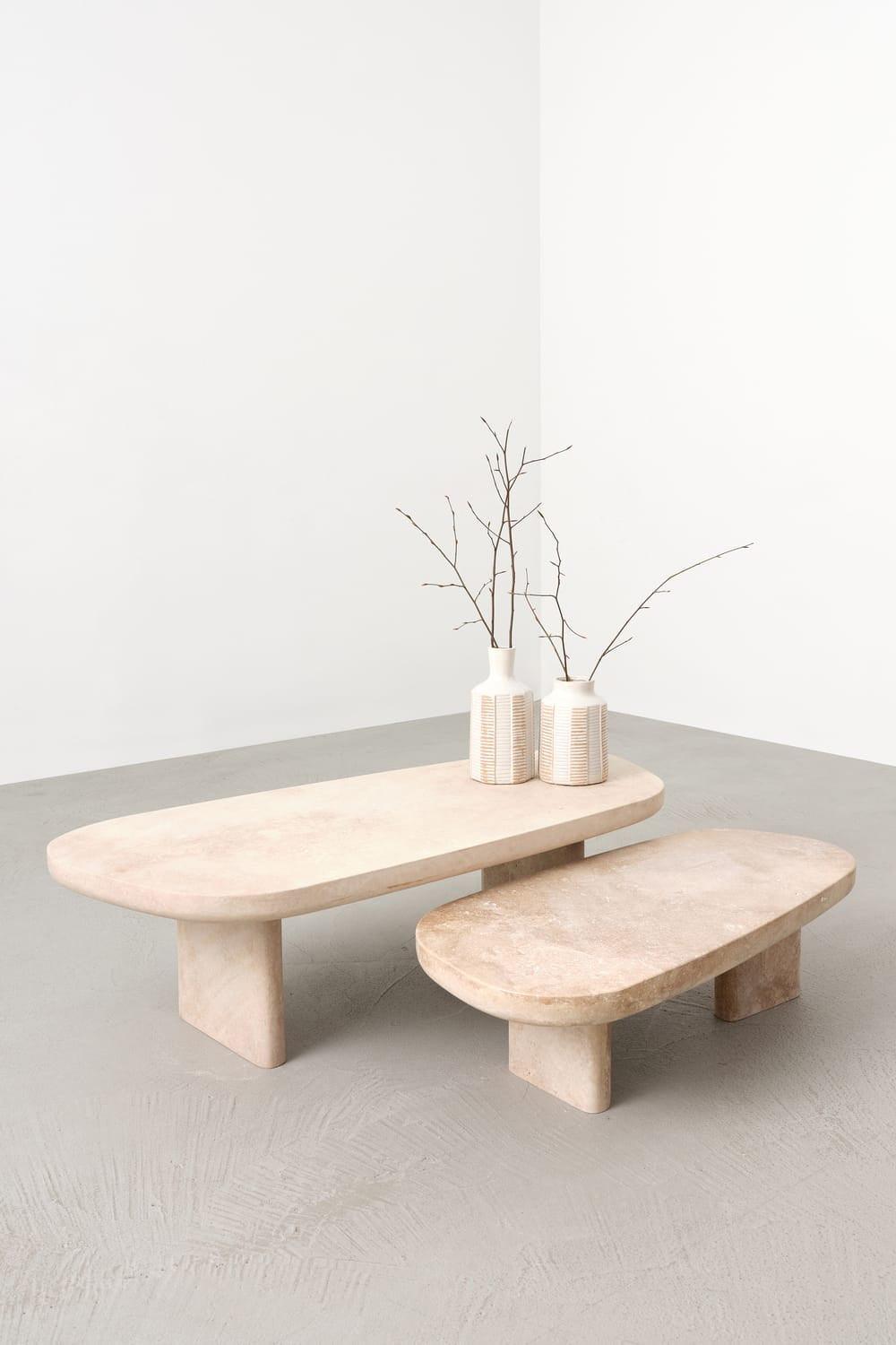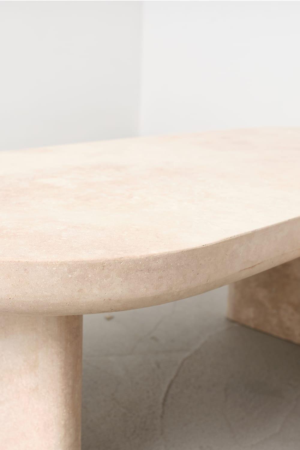 MASS sehpa, travertenin, malzemelerin sağlam özüne zıt olarak zarif bir şekilde işlenmesiyle oluşturulmuştur. Afyon'un taş ocaklarından çıkarılarak deneyimli ustalar tarafından şekillendirilmiştir. Geniş bir alanda, bütünlüğü yakalamak için MASS sehpanın küçük versiyonuyla birleştirilmesi tavsiye edilir.