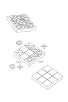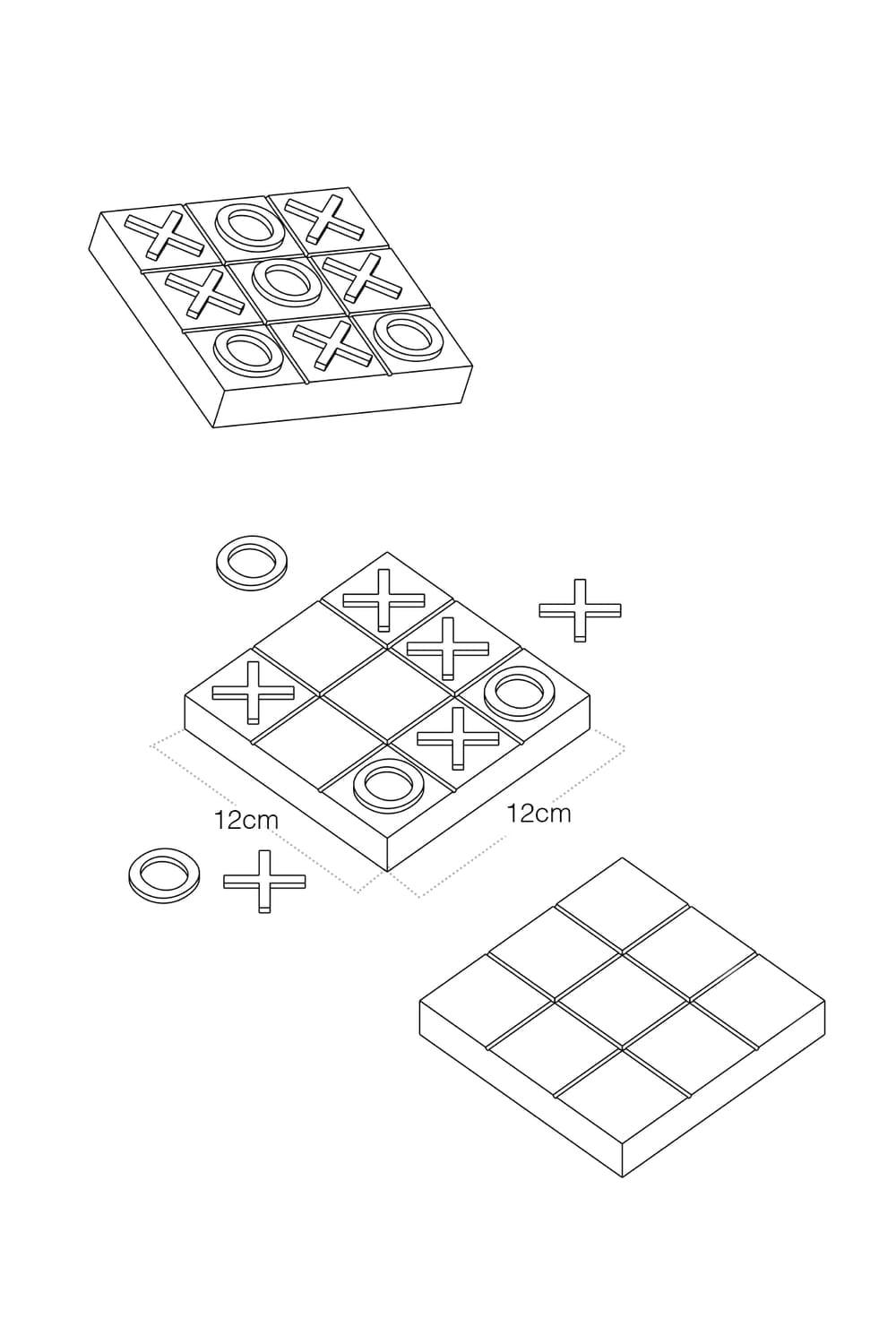 XOXO seti, kare şeklinde bir mermer taban ve ham pirinçten yapılmış on adet oyun parçasıyla birlikte gelir. Bu cilalı pirinç parçalar zamanla doğal bir patina geliştirecektir. Beyaz, siyah ve gri mermer seçenekleriyle her mekana uyum sağlayacak bir aksesuardır.