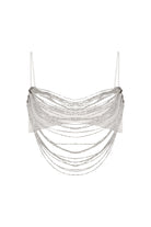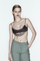 Şıklığı ve modern dokunuşu bir arada sunan bu bedeni saran jarse bra, boru boncuk şerit süslemeleriyle göz alıcı bir görünüm kazanıyor. Cam boncuk ve metal zincir detayları, tasarıma sofistike bir hava katarken esnek kumaşı sayesinde gün boyu konfor sağlıyor.
