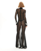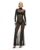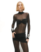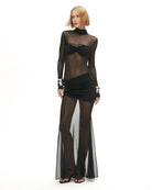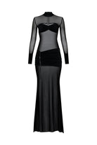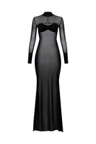 Siyah transparan tül elbise çıkarılabilir büzgülü eteğiyle hem estetik hem de fonksiyonel bir tasarıma sahiptir. Göğüs ve etek kısımlarındaki kemer detayları modern bir görünüm kazandırırken, vücuda oturan üst kısmı hatları ön plana çıkarır. Kol uçlarındaki çift kat tül ve gizli fermuar detayıyla şıklık ve konfor bir aradadır.