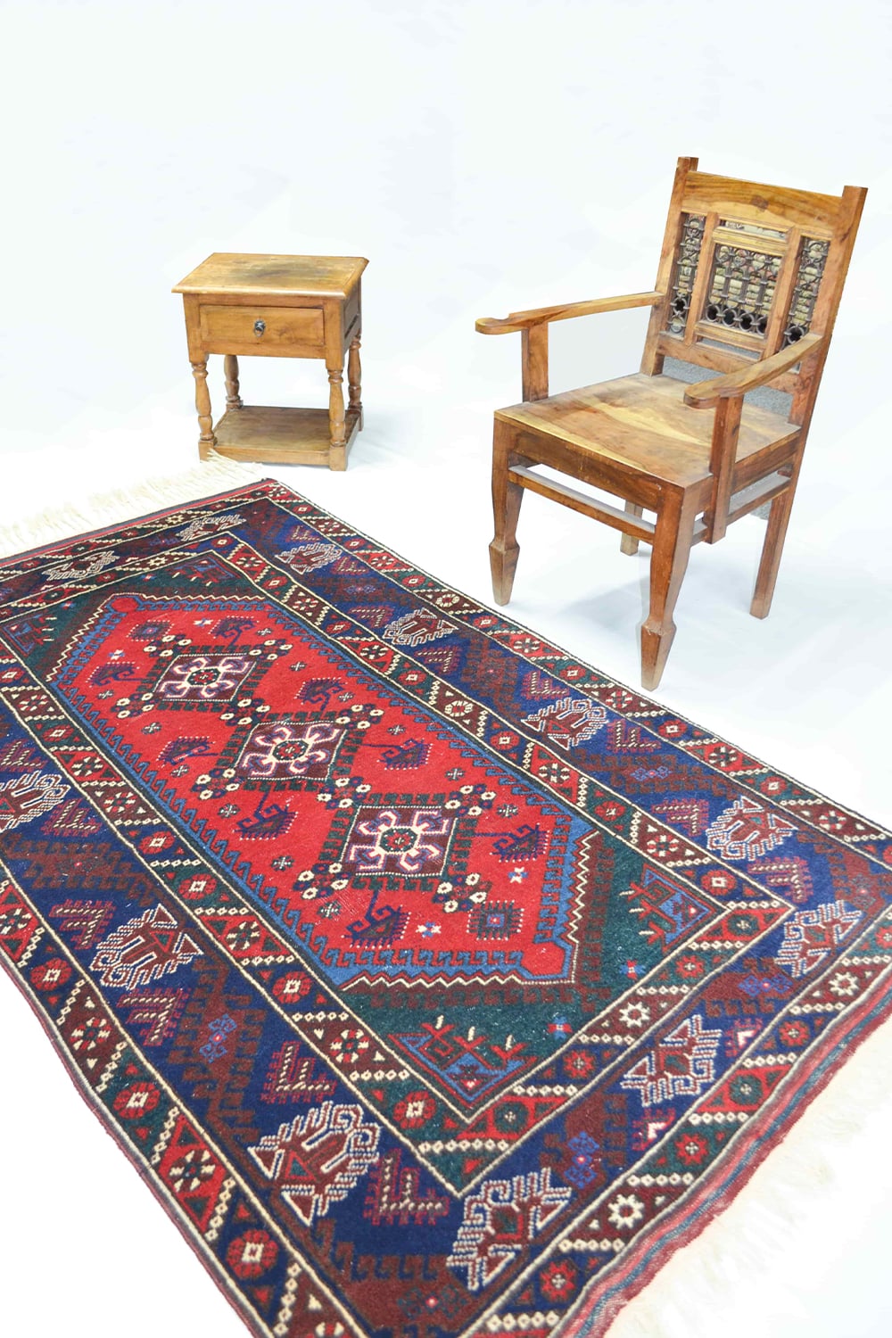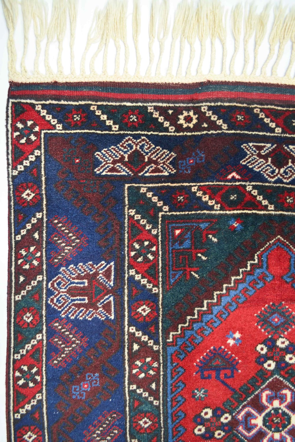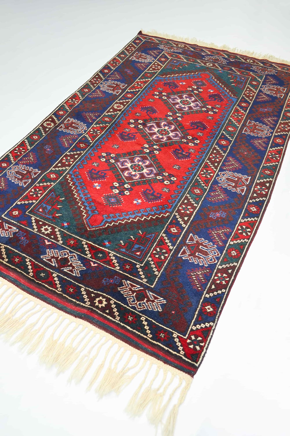 Antalya'nın Döşemealtı bölgesine özgü geleneksel halı dokuma sanatıyla üretilen bu el dokuma halı, yün saçak üzerine Kirman yününden, doğal kökboyalarla renklendirilerek dokunmuştur. 125x202 cm ölçüsündeki halı, kırmızı ve lacivert renklerin güçlü kontrastıyla dikkat çeker.