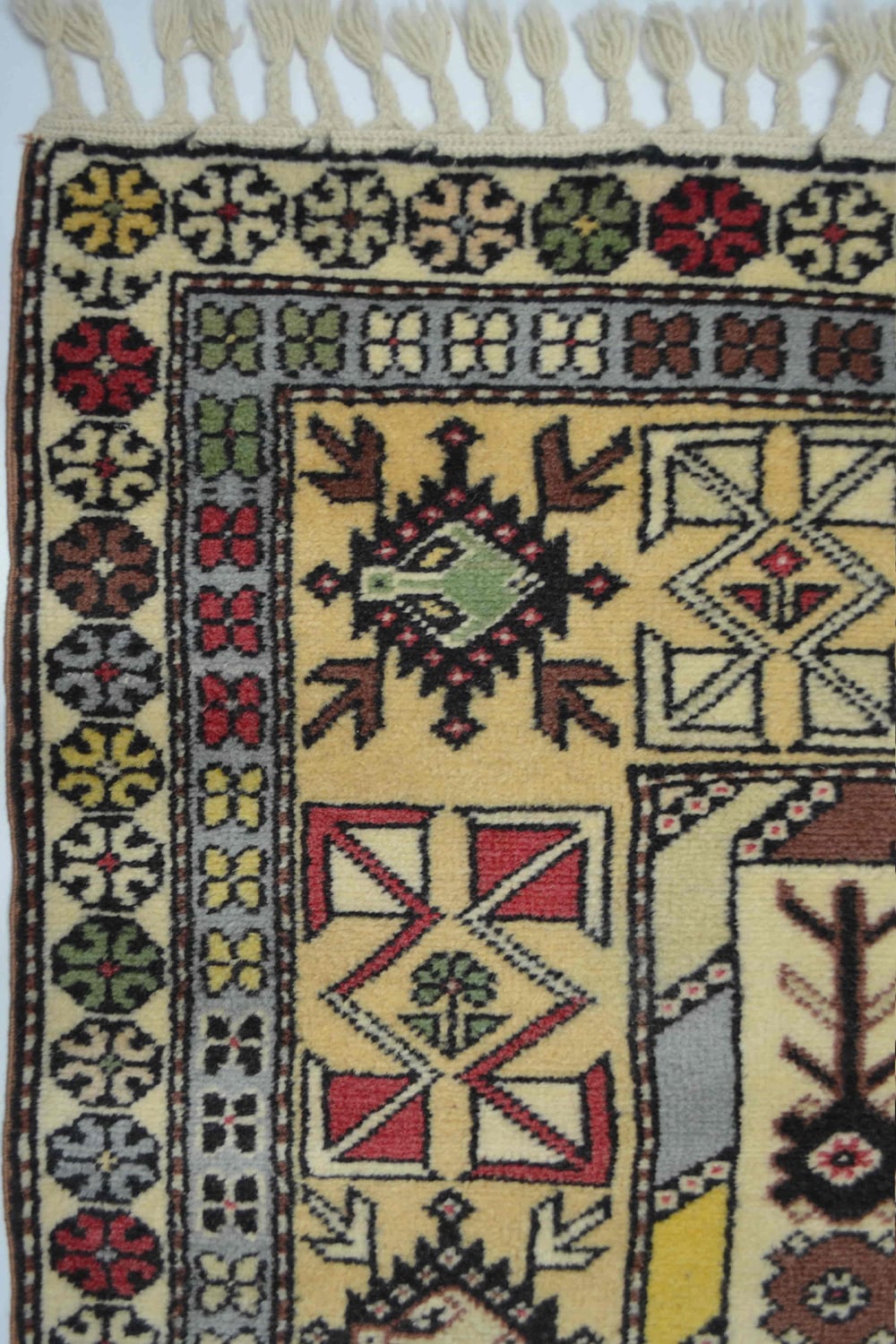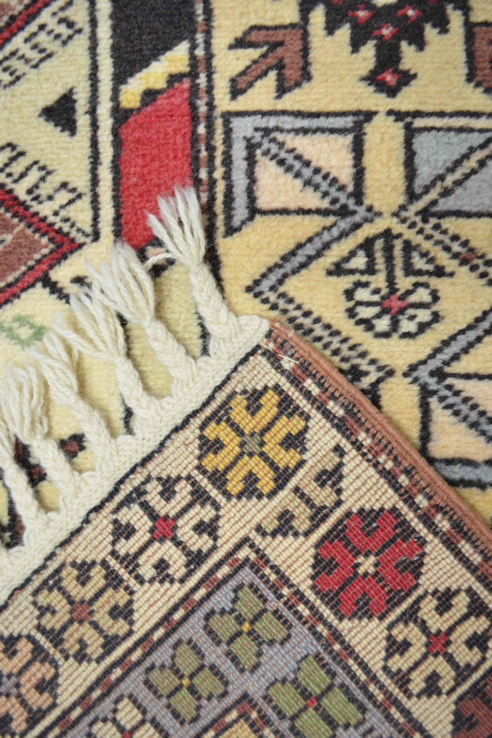 Milas halılarının en değerli gruplarından biri olan Bozalan modeli, bu parçada yün saçak üzerine Kirman iplik kullanılarak geleneksel motiflerle hayat buluyor. El dokuma olarak üretilen halı, Milas’a özgü pastel tonlarla bej ve kiremit renklerini ustalıkla harmanlar.