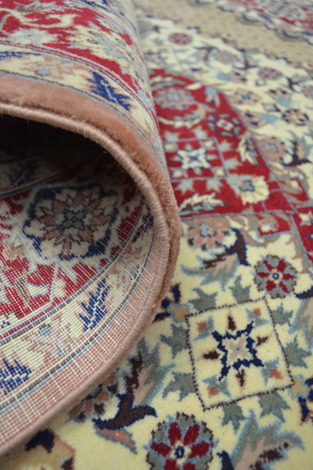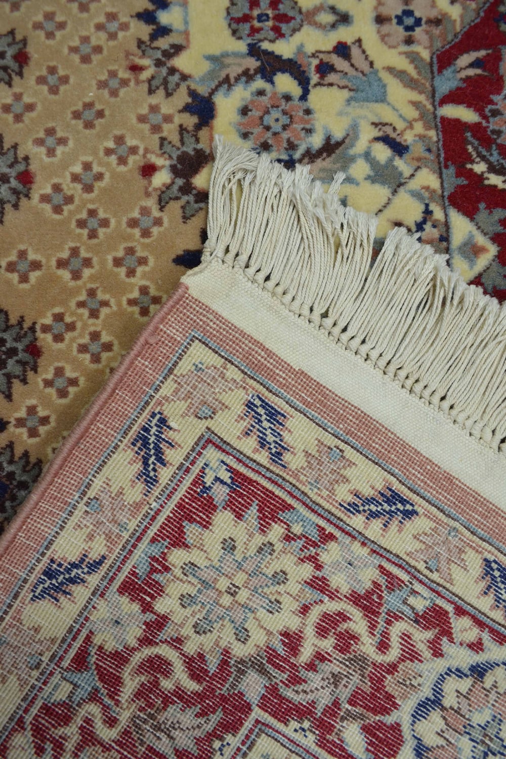 60×60 düğüm sıklığında, yüksek kalitede el işçiliğiyle dokunan bu İran Saruk halısı, Kirman yününden pamuk saçak üzerine üretilmiştir. Zarif desenleri ve detaylı motifleriyle Saruk halı geleneğinin en güzel örneklerinden biridir.