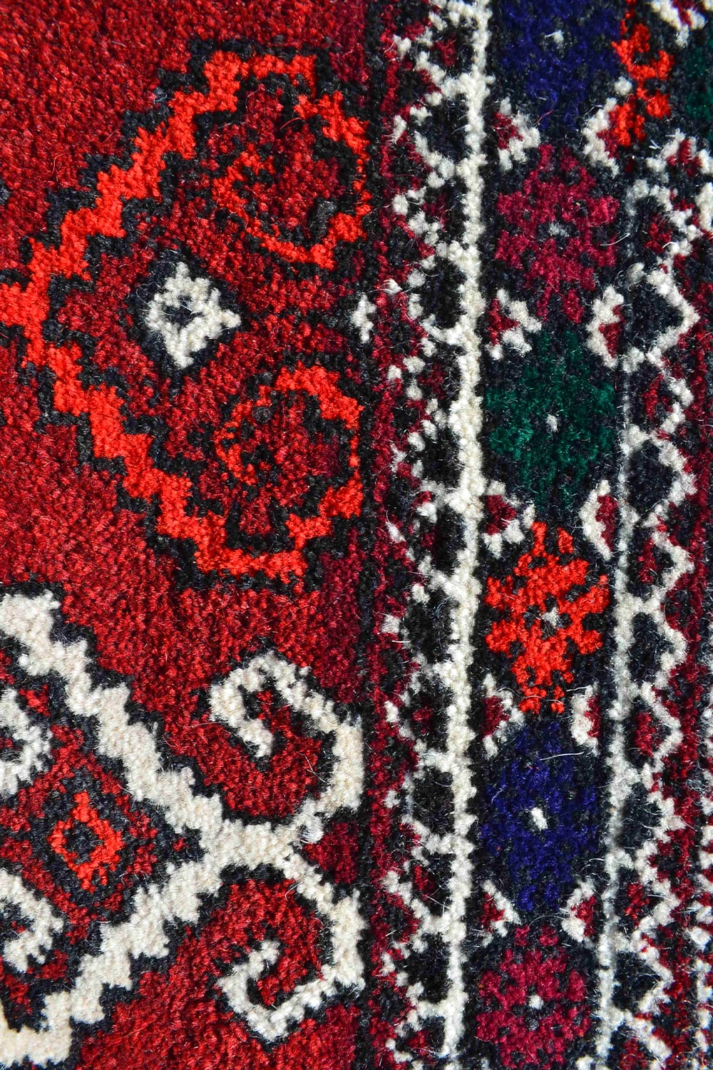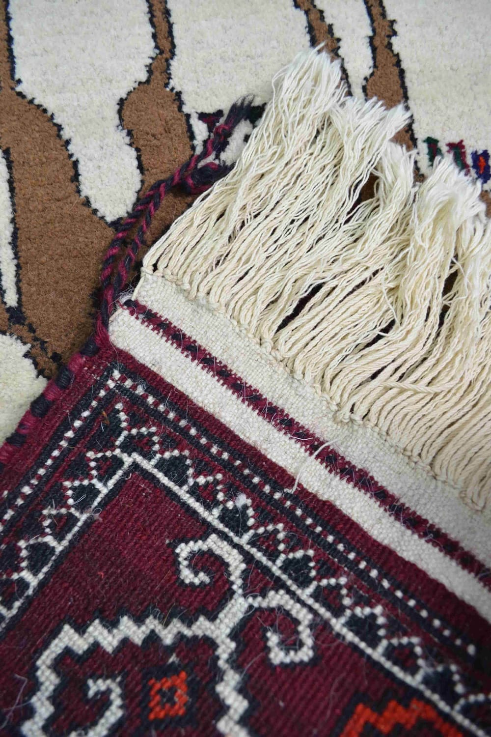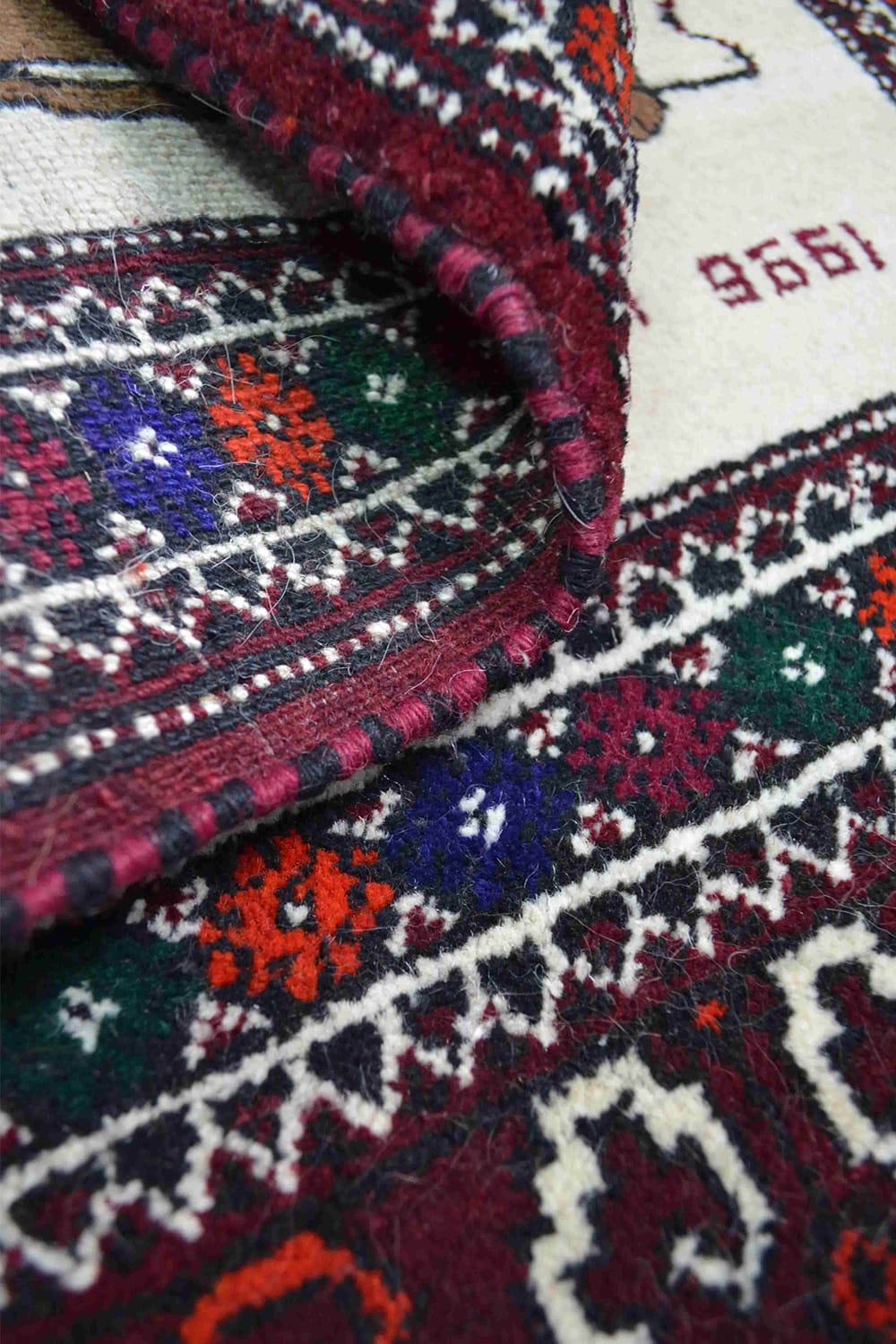 Bu özel Türkmen halısı, geleneksel el dokuma teknikleriyle üretilmiş olup %100 yün iplikten dokunmuştur. Bordo ve krem renklerin uyumu, halının üzerindeki deve figürü ve "1996" detayıyla birleşerek otantik bir görünüm sunar. 60x80 cm (0.48 m²) ölçüsü sayesinde oturma odası, yatak odası veya giriş alanlarında dekoratif bir tamamlayıcı olarak kullanılabilir. Yüksek kaliteli yün malzemesi ve el işçiliği sayesinde dayanıklı ve uzun ömürlüdür.