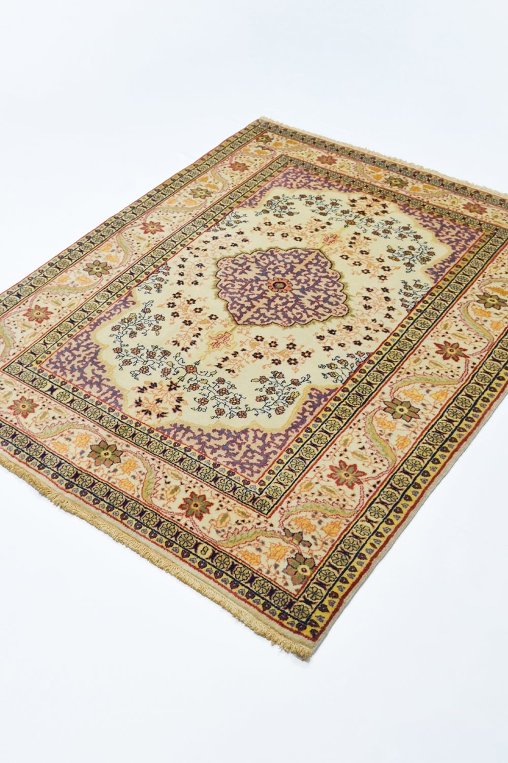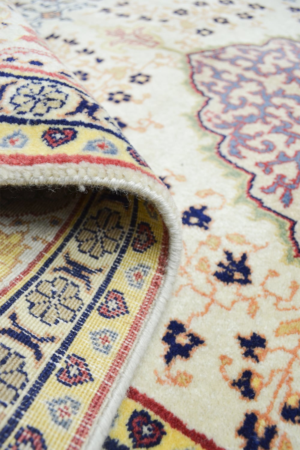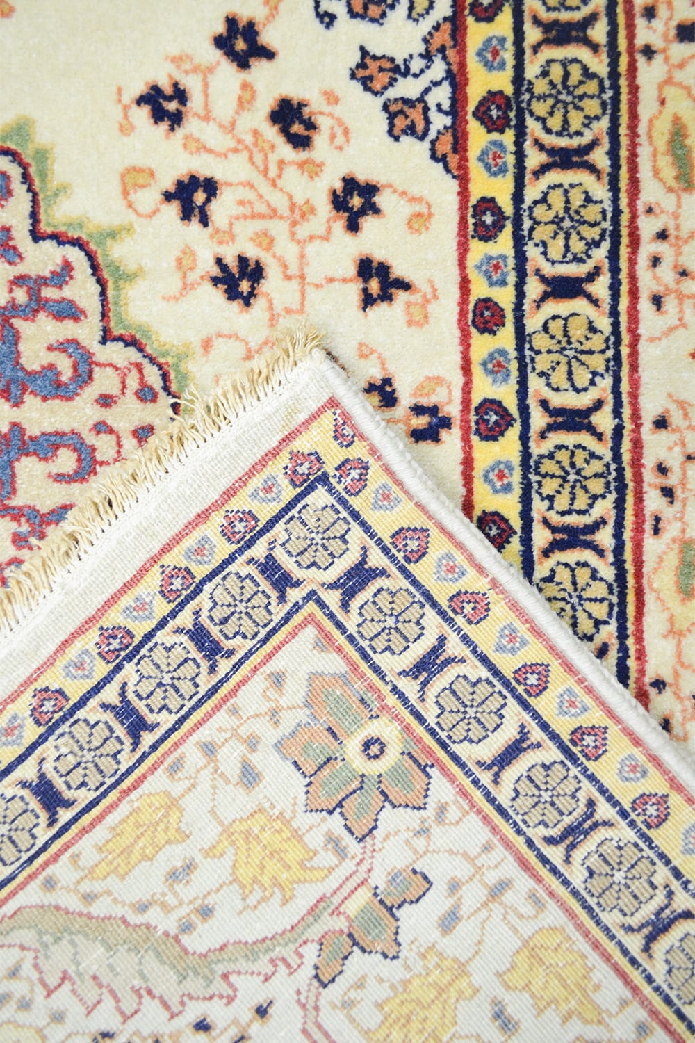 Bu model krem zemin üzerine işlenmiş madalyon motifleri ile dikkat çeker. Klasik İran estetiğinin simgesi olan madalyon deseni, mekâna hem zarif bir odak noktası hem de sofistike bir dokunuş katar. Doğal kök boyalar ile renklendirilmiş yün, ışık açısına göre ton değişimleri göstererek halıya yaşayan bir estetik kazandırır.