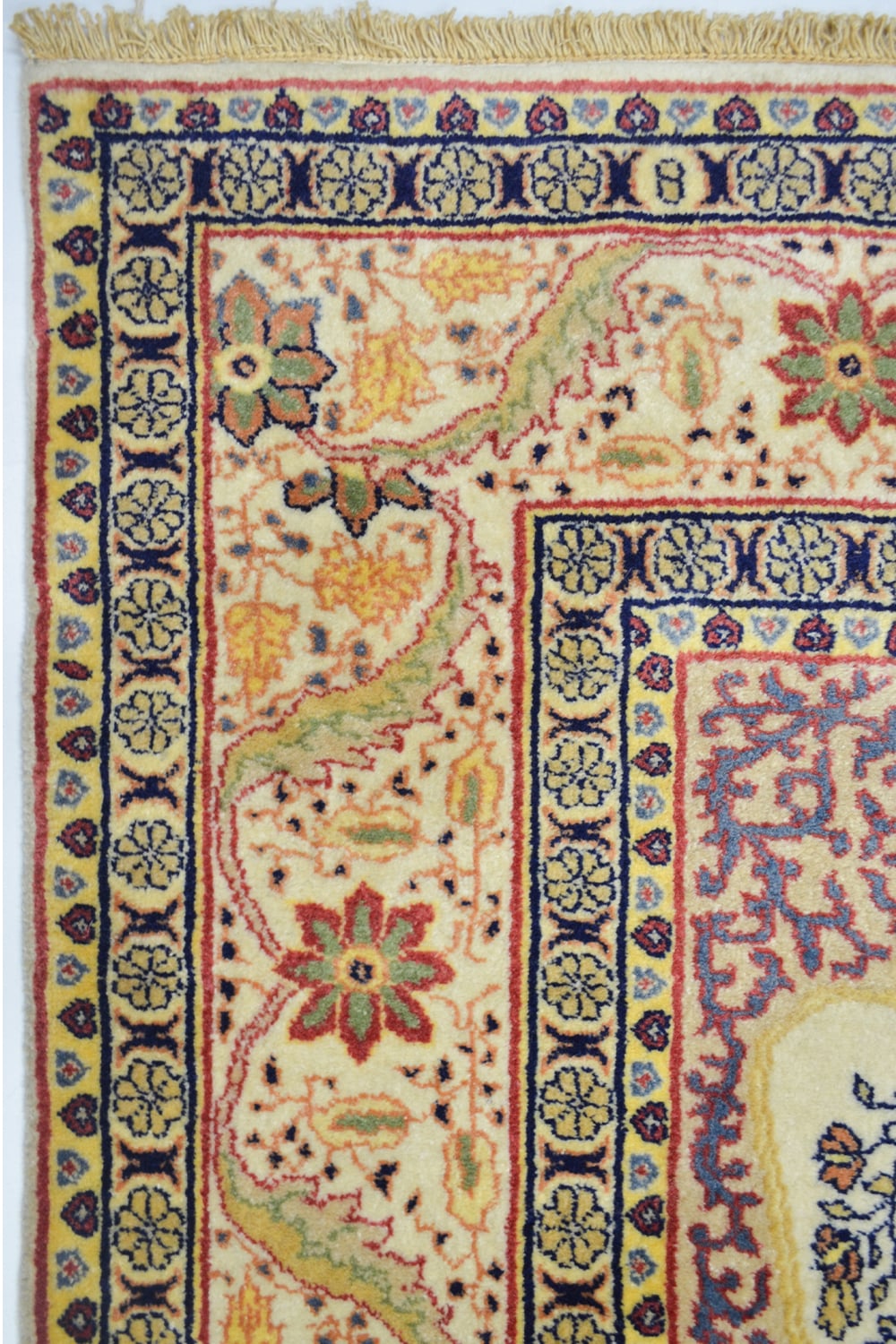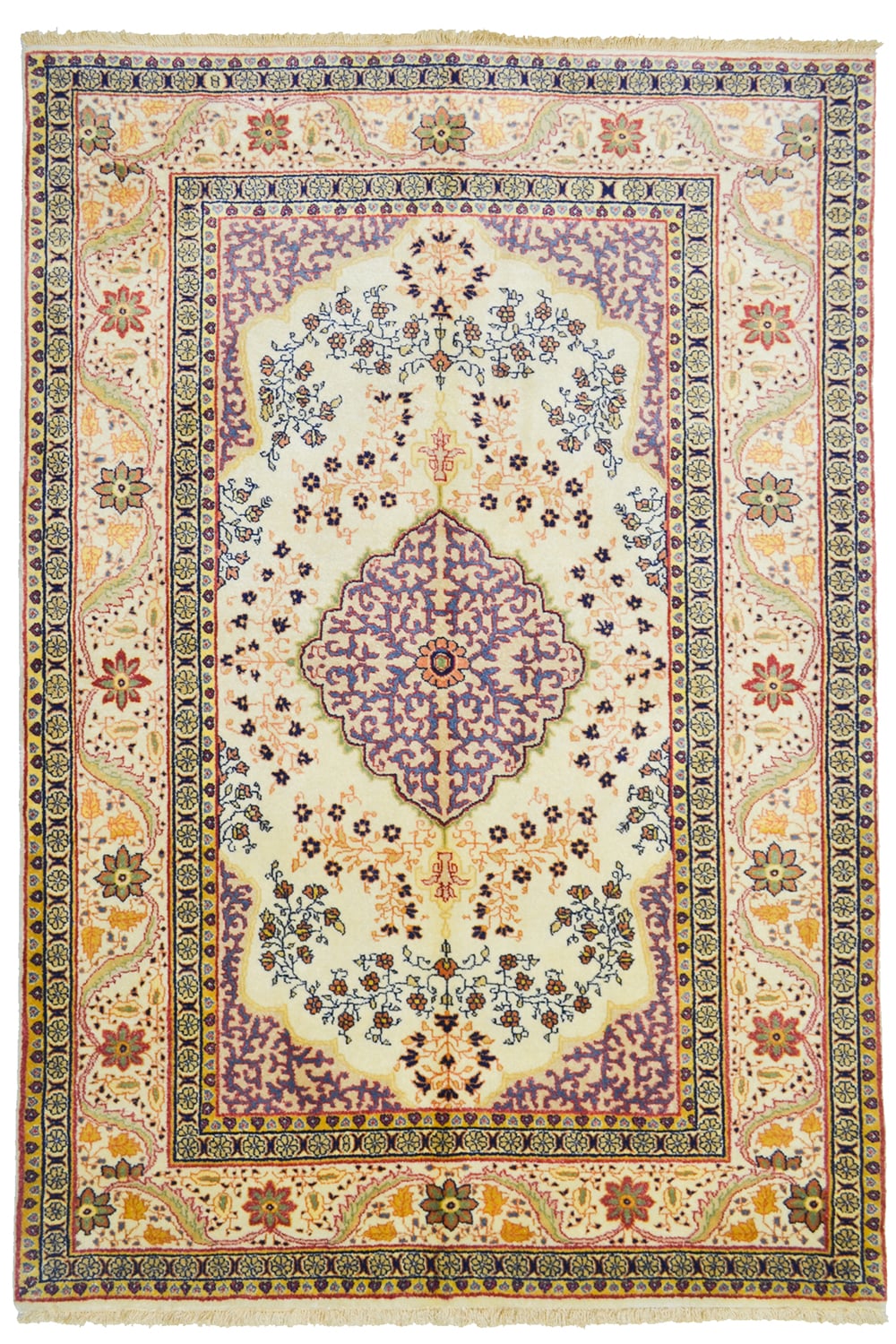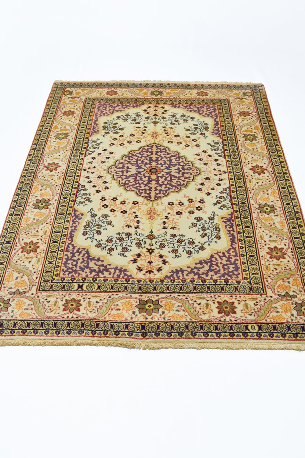 Bu model krem zemin üzerine işlenmiş madalyon motifleri ile dikkat çeker. Klasik İran estetiğinin simgesi olan madalyon deseni, mekâna hem zarif bir odak noktası hem de sofistike bir dokunuş katar. Doğal kök boyalar ile renklendirilmiş yün, ışık açısına göre ton değişimleri göstererek halıya yaşayan bir estetik kazandırır.