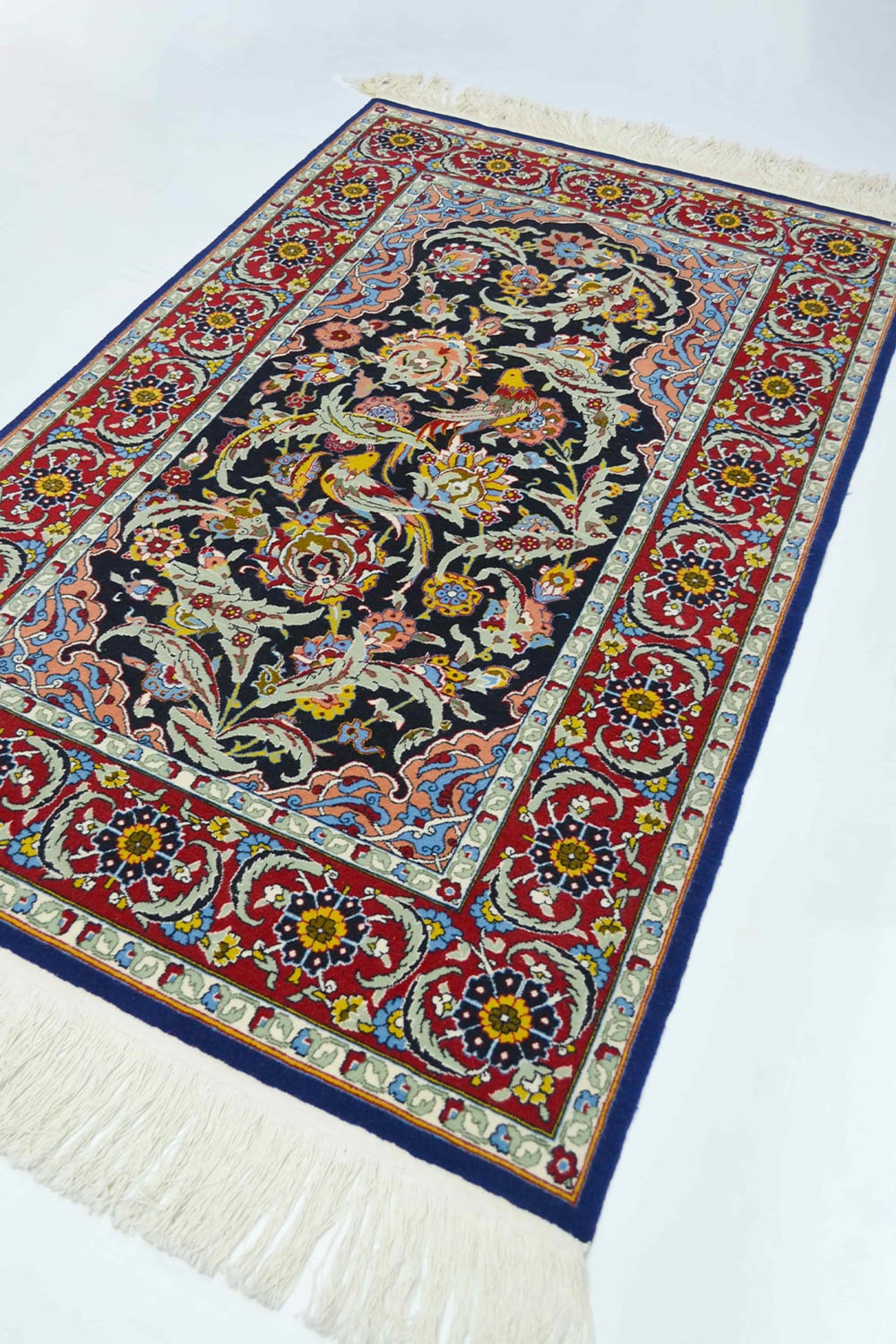 Siyah ve bordo renklerin zarif uyumuna sahip bu model, klasik Hereke tasarımlarının önemli örneklerinden biri olan mihrap ve kuş desenleriyle bezenmiştir. Motiflerdeki sembolik anlatım ve sanatsal derinlik, hem dekoratif hem kültürel değer taşır. Yaşam alanlarına estetik bir duruş ve otantik bir hava katar.