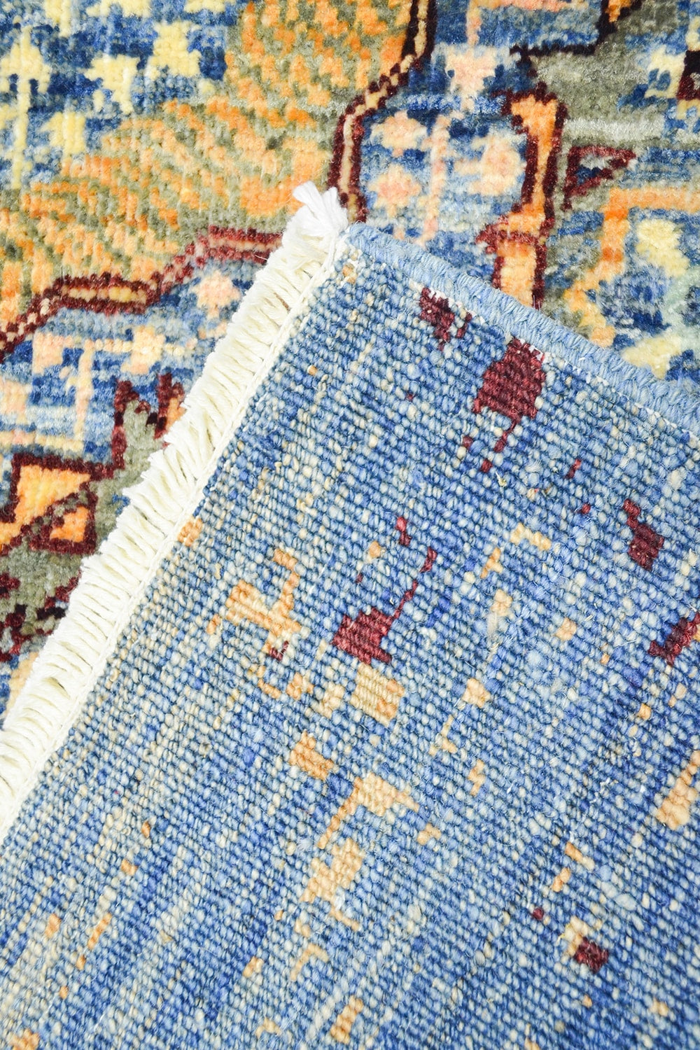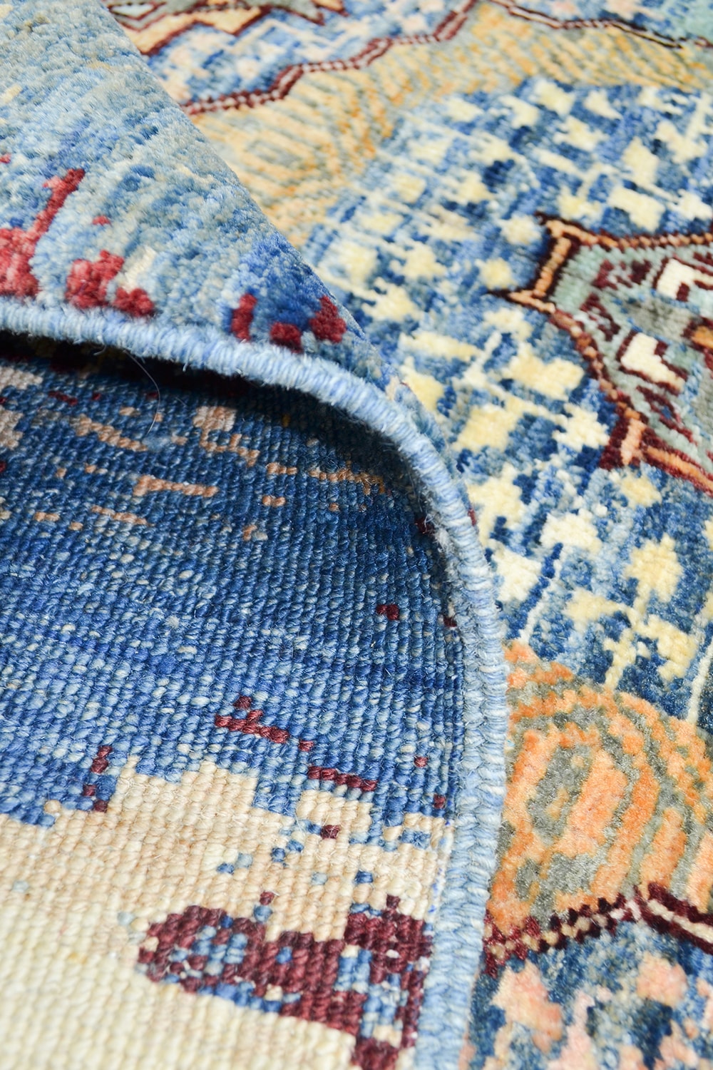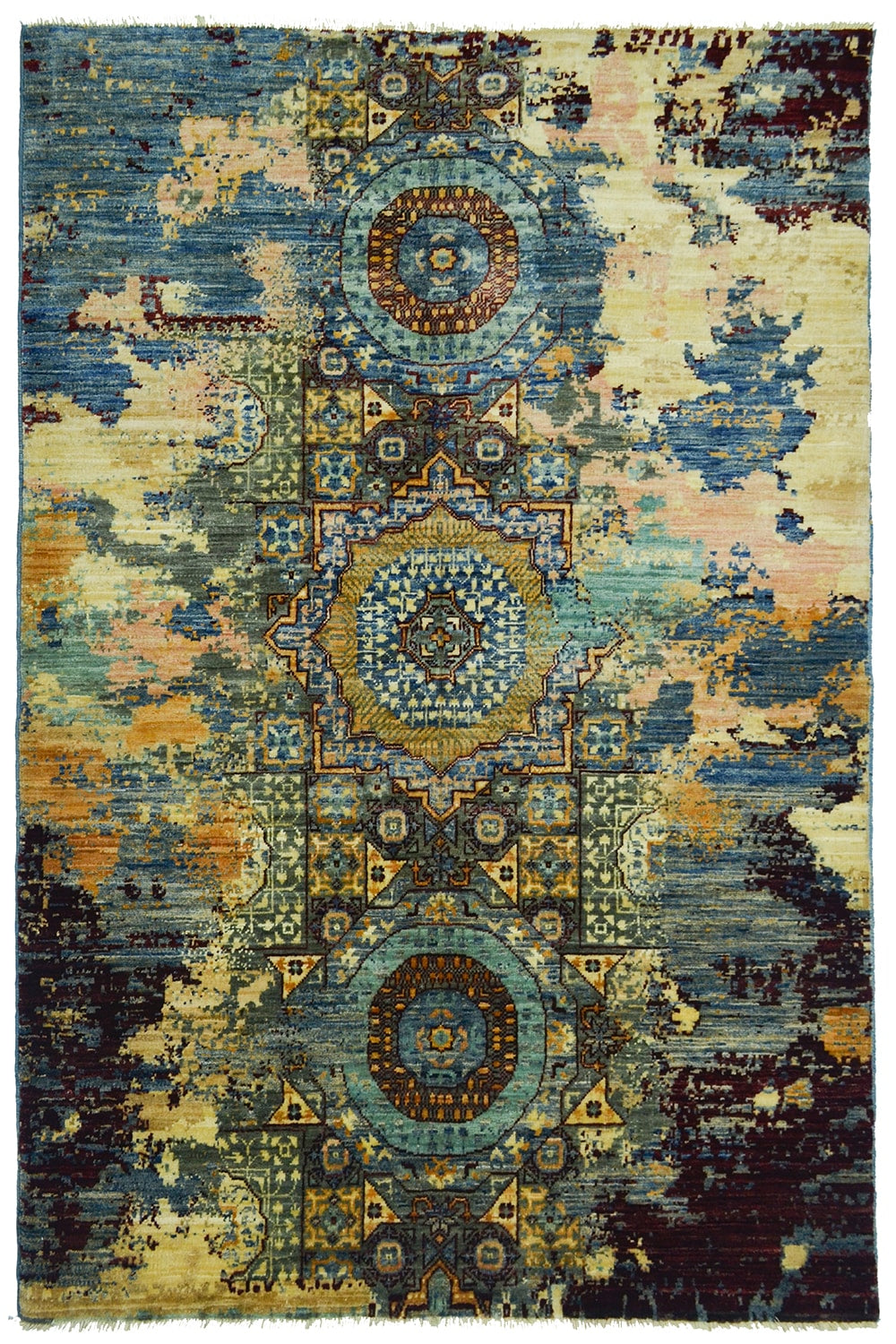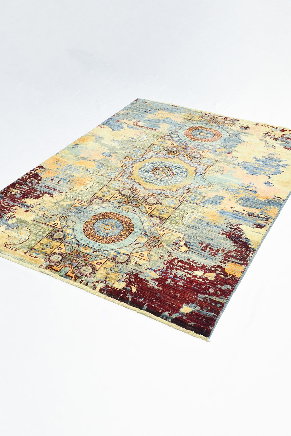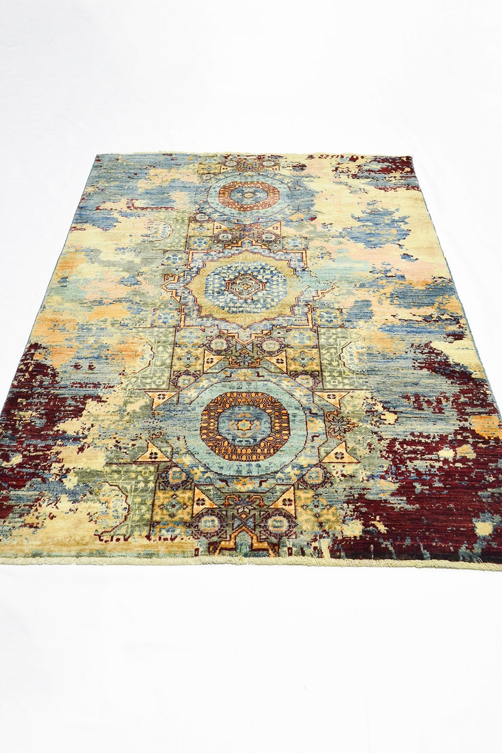 Klasik Memlük desenlerinin modern bir yorumu olan bu Afgan halısı, 121x176 cm (2.13 m²) ölçüsündedir. %100 yün ipliklerle dokunan halı, ebruli renk geçişleriyle geleneksel deseni çağdaş bir estetikle buluşturur.