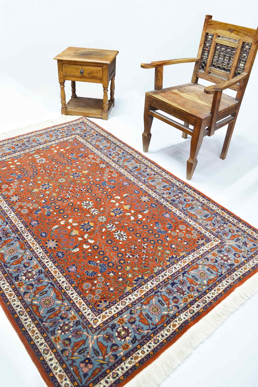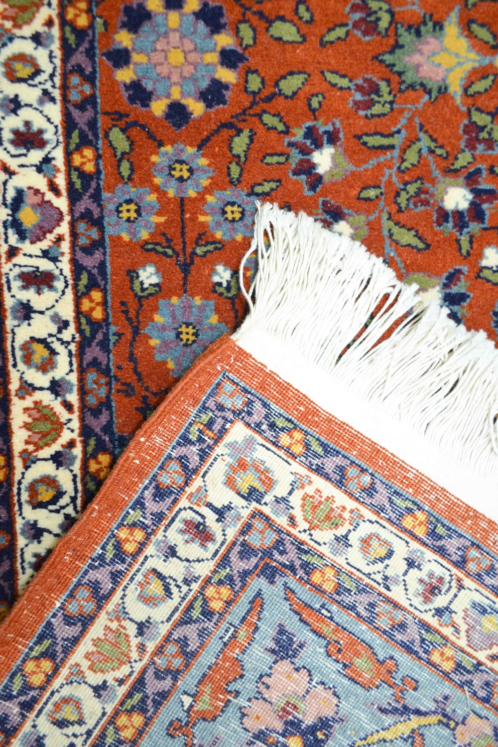 Kiremit rengi zemin üzerine işlenen motifler, doğadan esinlenen estetik bir görünüm sunarken aynı zamanda klasik Türk halı sanatının inceliklerini yansıtır. 131x192 cm ölçüsüyle hem fonksiyonel hem de dekoratif bir parça olarak yaşam alanlarını zenginleştirir.