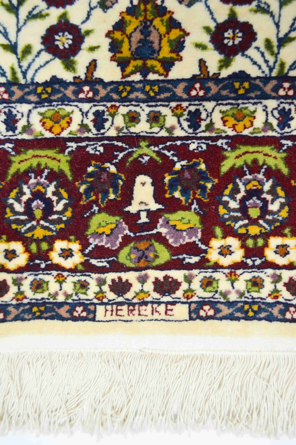 60×60 düğüm kalitesinde, metrekaresinde yaklaşık 360.000 ilmek sıklığına sahip bu orijinal Hereke halısı, pamuk saçak üzerine yün iplikle özenle el dokuma olarak üretilmiştir. Hereke halıcılığının seçkin örneklerinden biri olan bu model, “Yedi Dağın Çiçeği” olarak bilinen zarif desenle süslenmiştir.