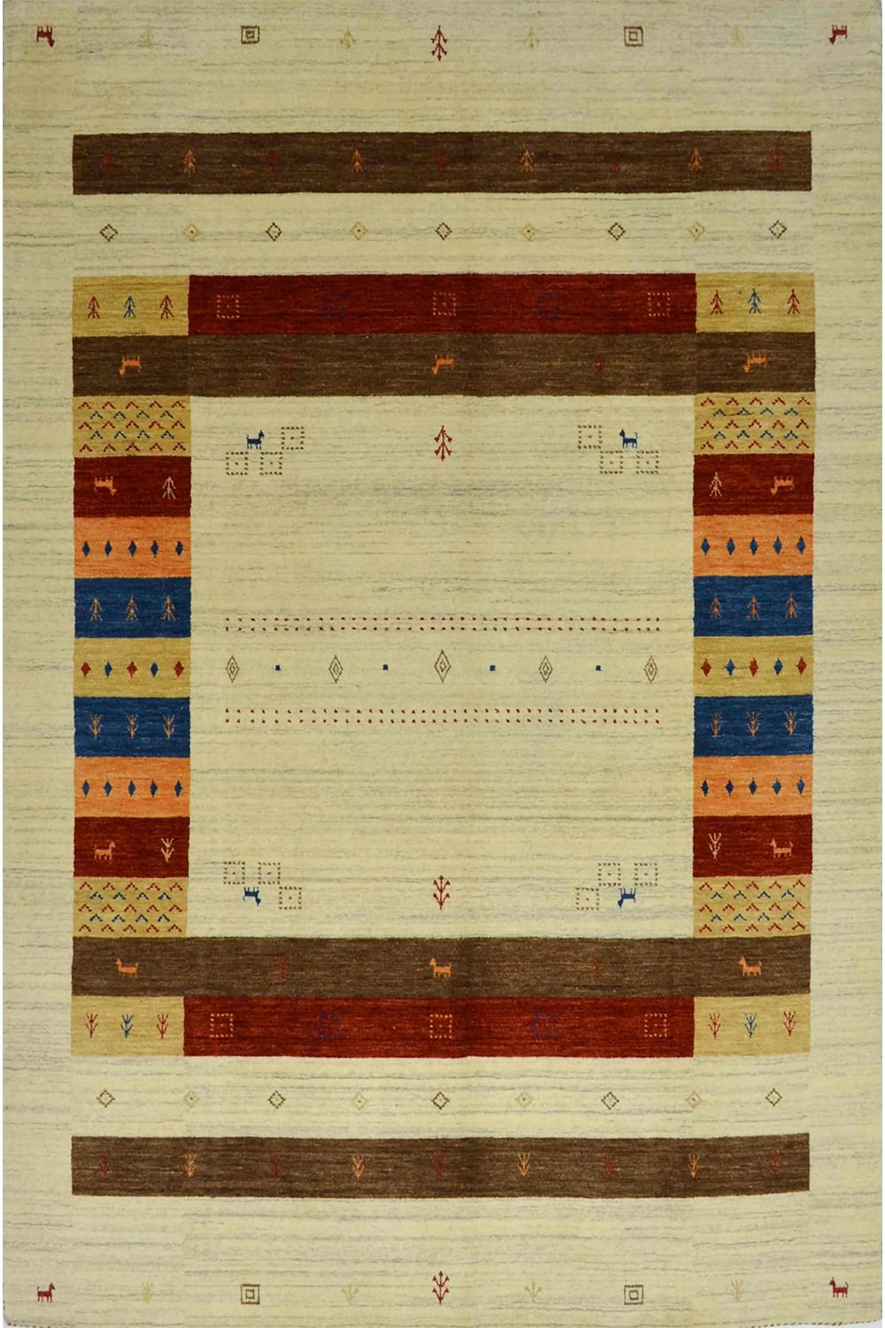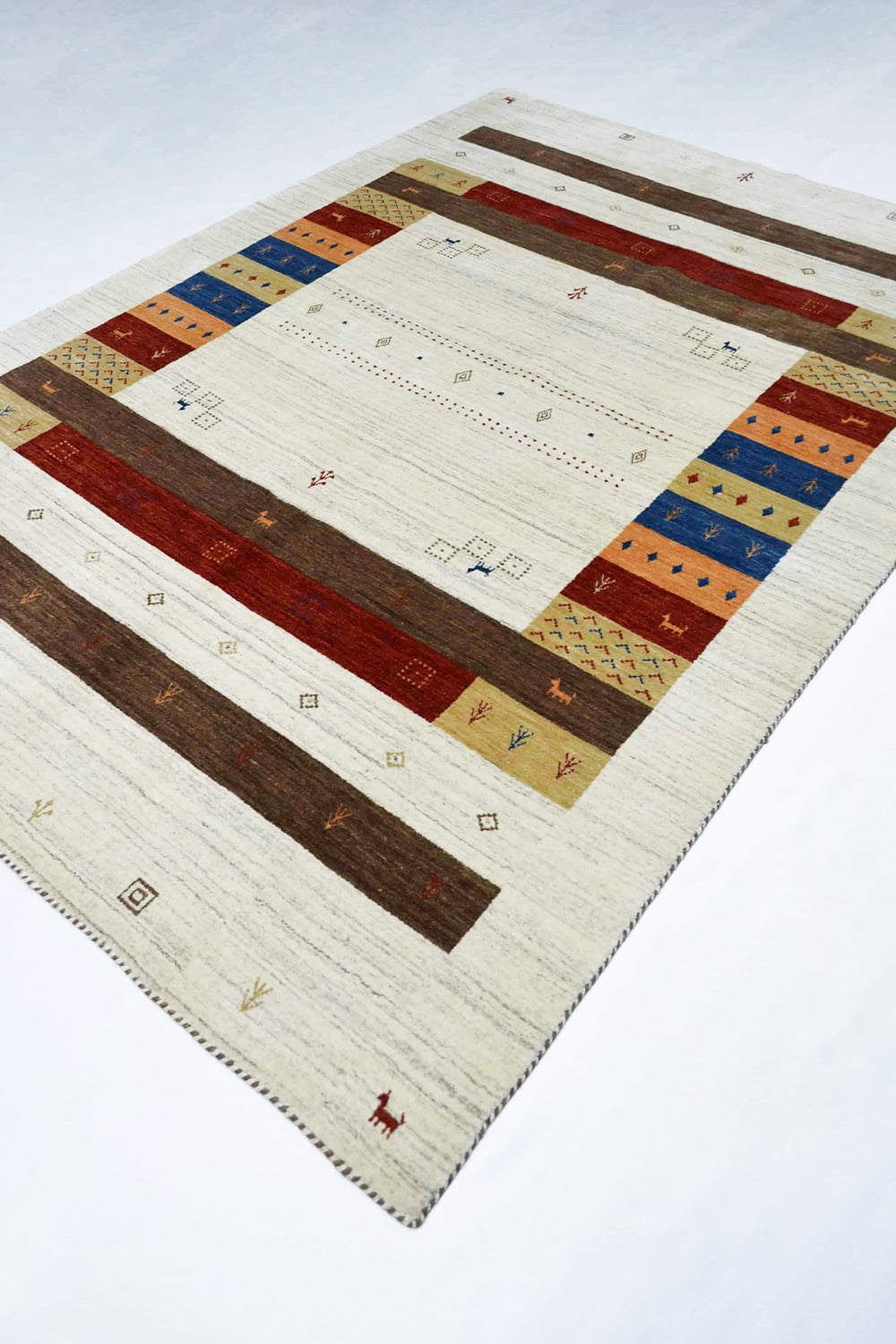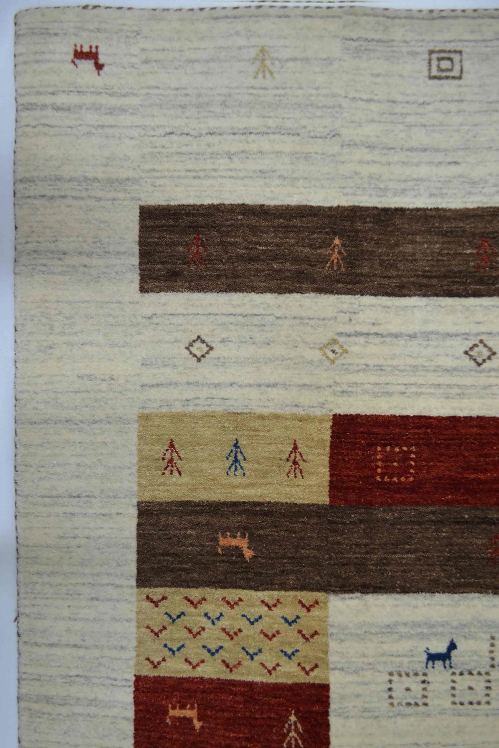 Doğal tonları ve sade şıklığıyla öne çıkan bu el dokuma Afgan Gabbe halı, kirman yünü ve yün saçak kullanılarak üretilmiştir. Geleneksel Afgan motiflerinden ilham alan desenleriyle zamansız bir estetik sunan halı, kahve ve krem renk paletiyle yaşam alanlarına huzurlu bir atmosfer kazandırır.