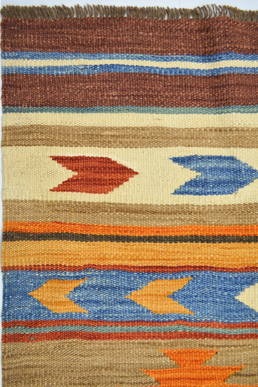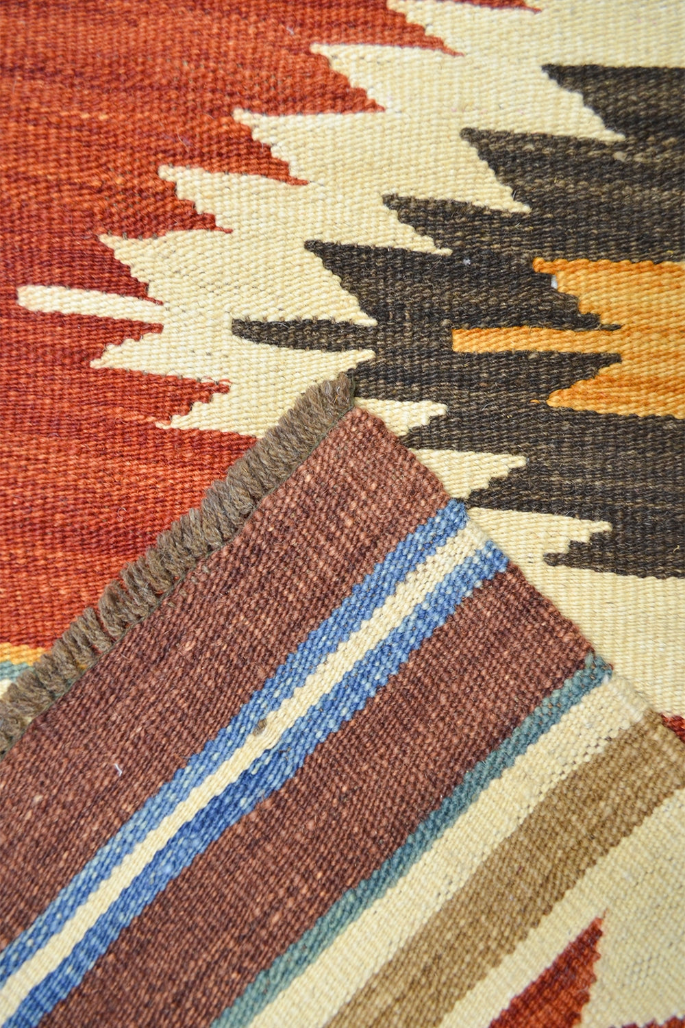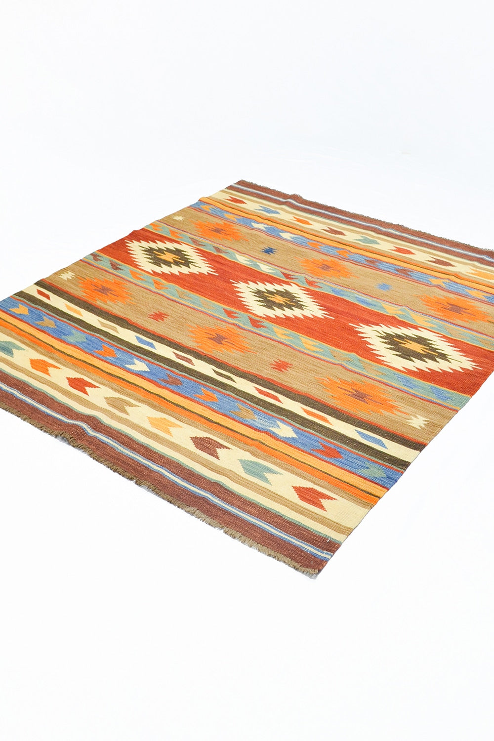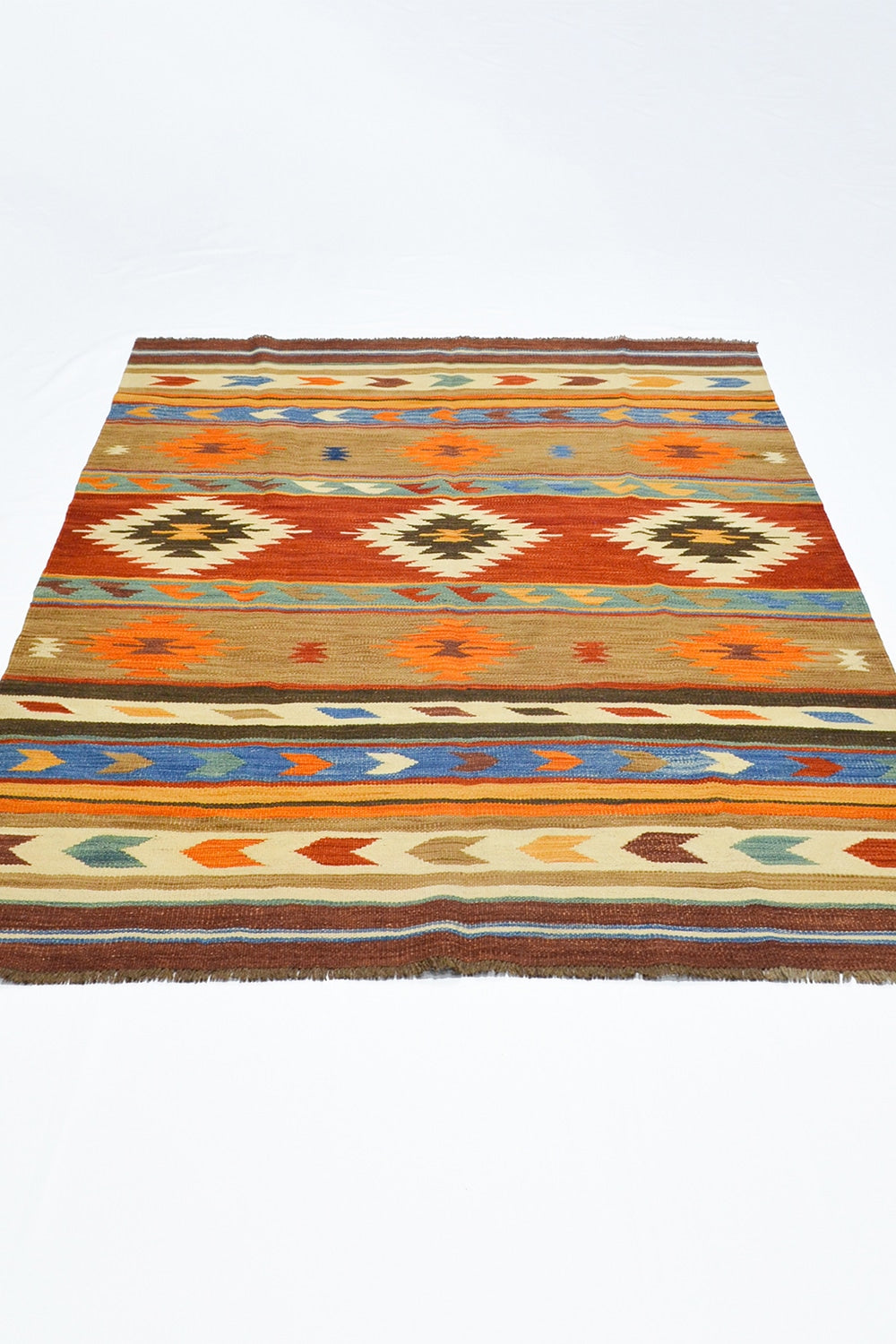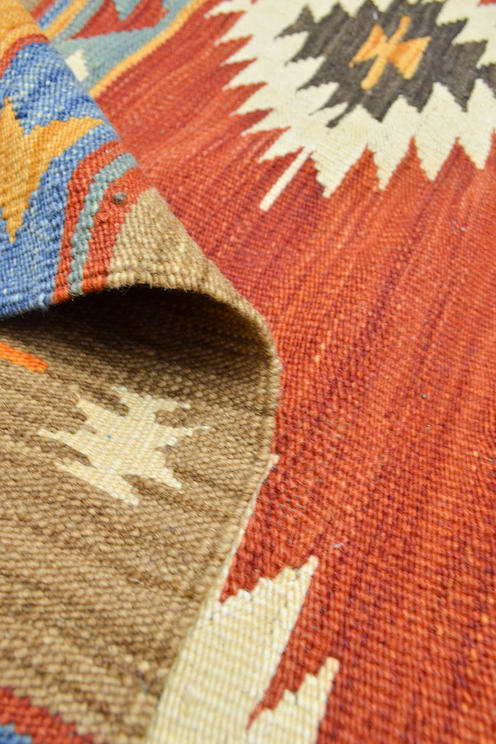 Bu Afgan Kilimi, tamamen yün ipliklerle el dokuması olarak hazırlanmıştır. Çok renkli desenleri, mekânlara canlılık ve otantik bir hava katar. Geleneksel Afgan dokuma teknikleriyle üretilen bu kilim, hem dekoratif hem de fonksiyonel bir kullanım sunar.