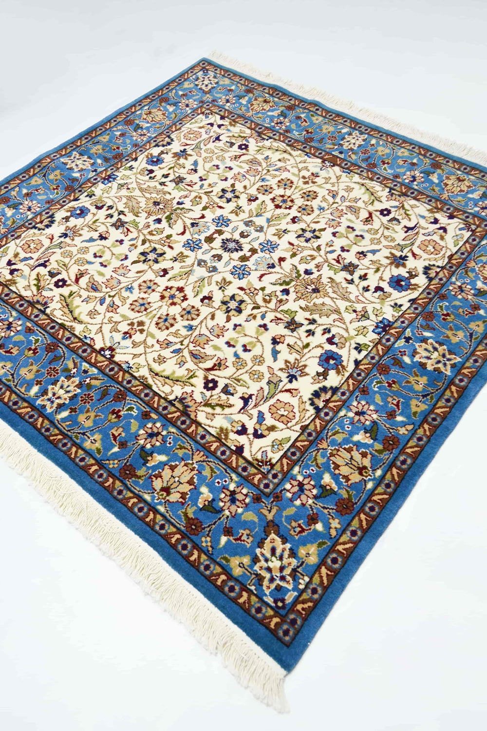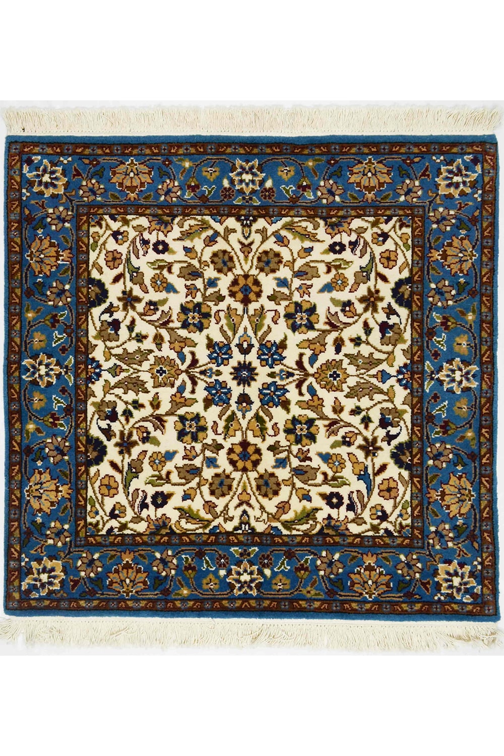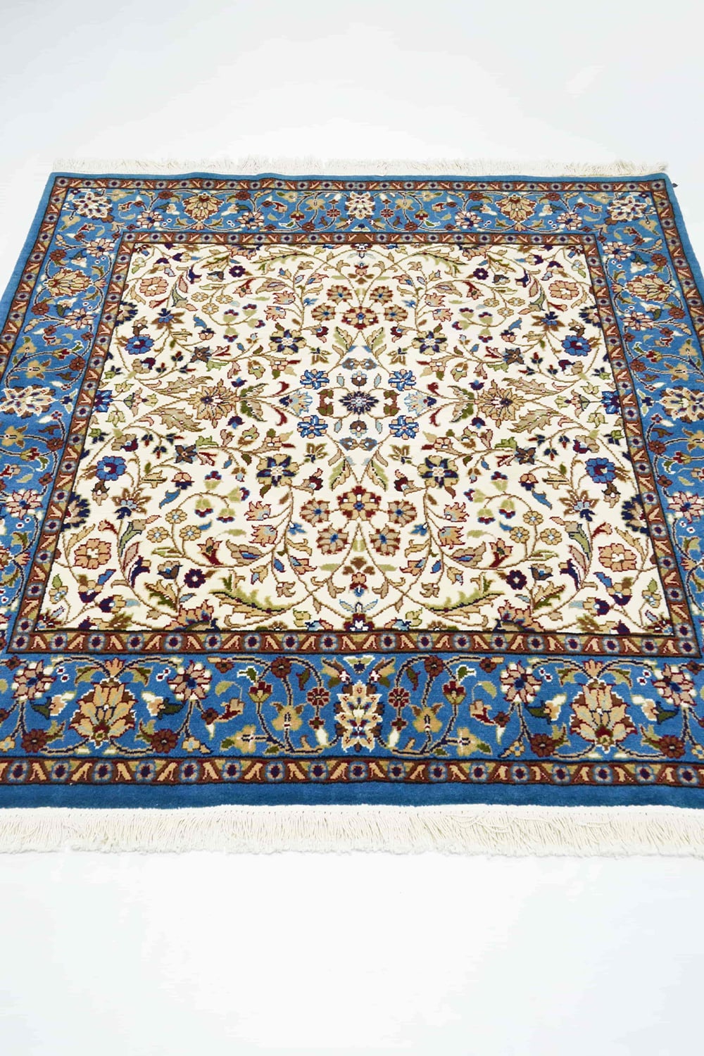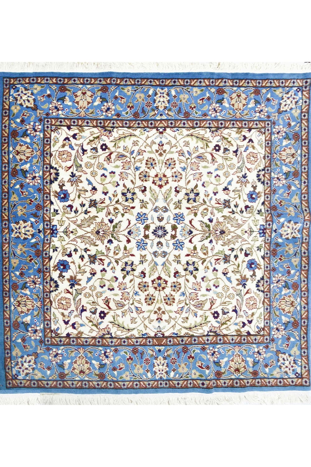 İran halı dokuma geleneğinin zarif bir örneği olan bu kare formdaki el dokuma halı, 60×60 düğüm sıklığıyla yüksek kalitede işçilik sunar. Kirman yününden, pamuk saçak üzerine özenle dokunan bu halı; klasik İran çiçek motiflerini, krem ve mavi tonların dingin uyumuyla birleştirir.