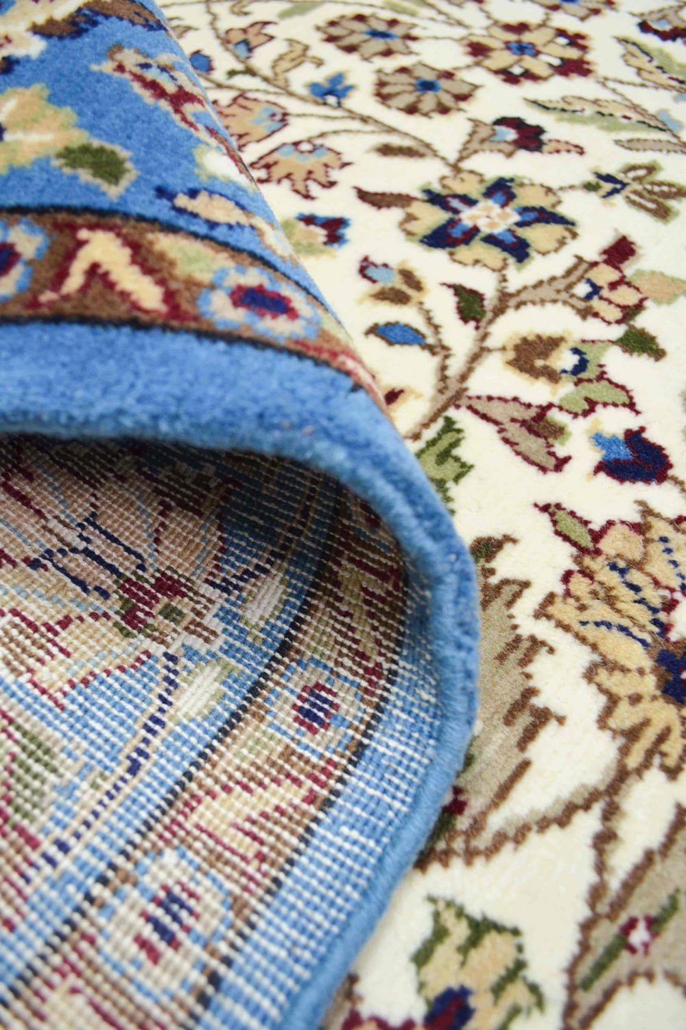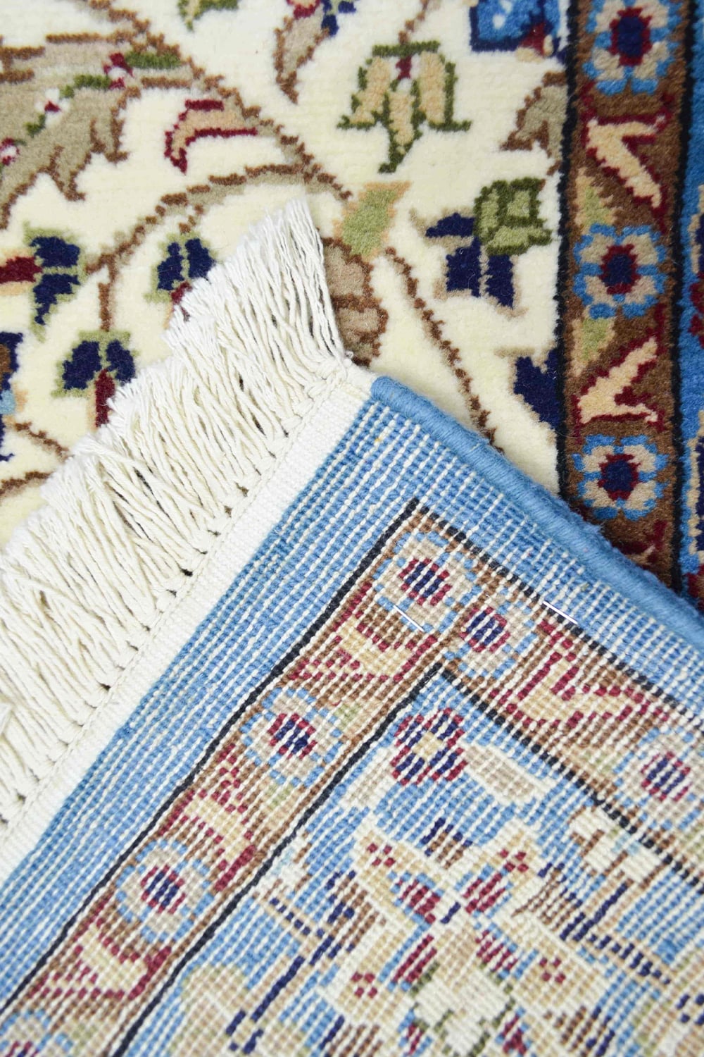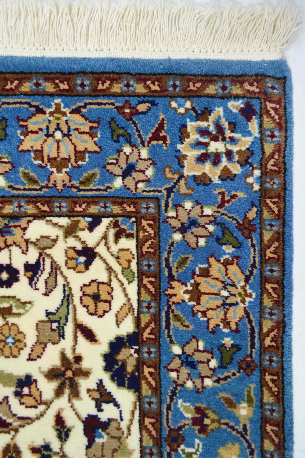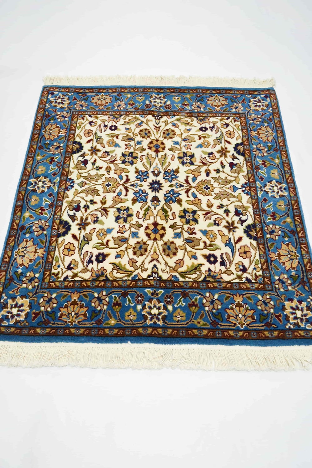 İran halı dokuma geleneğinin zarif bir örneği olan bu kare formdaki el dokuma halı, 60×60 düğüm sıklığıyla yüksek kalitede işçilik sunar. Kirman yününden, pamuk saçak üzerine özenle dokunan bu halı; klasik İran çiçek motiflerini, krem ve mavi tonların dingin uyumuyla birleştirir.