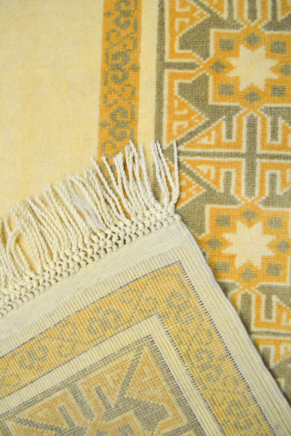 Anadolu’nun göçebe dokuma geleneğini yansıtan Selçuklu Yörük Halısı, yün saçak üzerine Kirman ipliğiyle tamamen el dokuması olarak üretilmiştir. Doğal kökboyalarla renklendirilen iplikler, halıya hem otantik bir görünüm hem de uzun ömürlü renk canlılığı kazandırır.