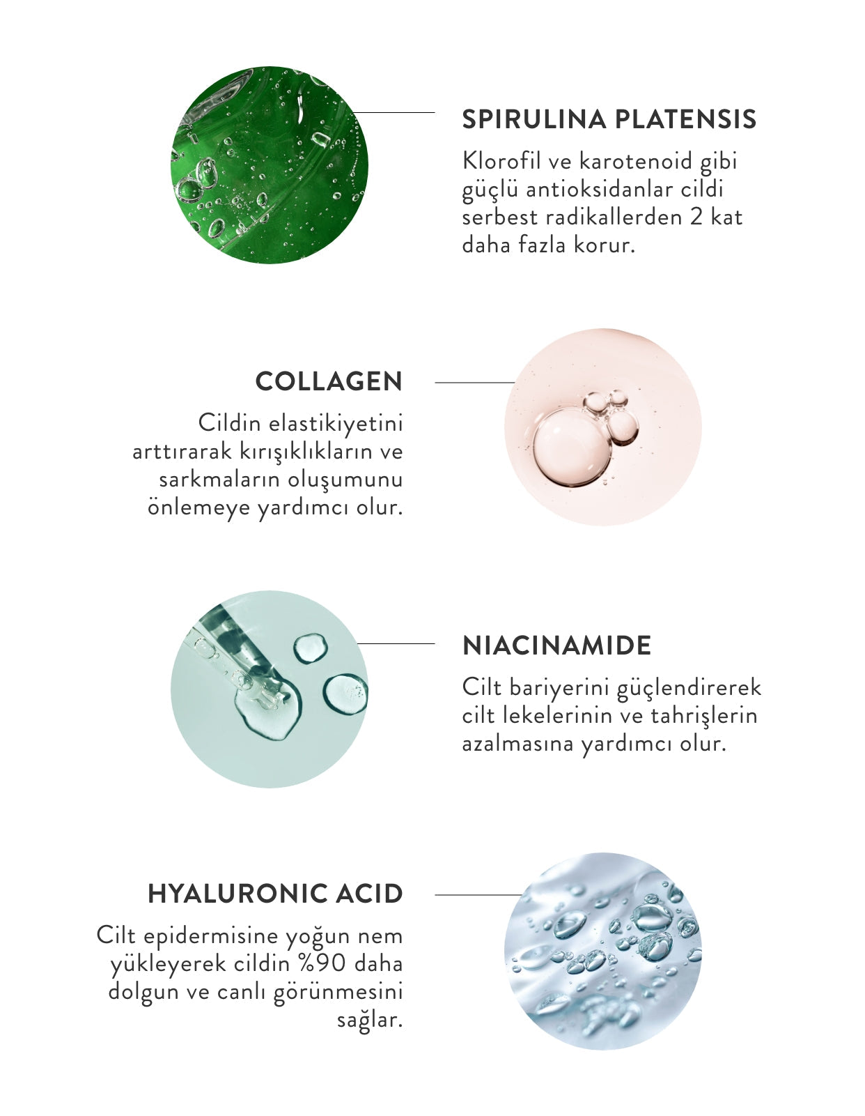 Cildi UVA/UVB ışınlarına karşı koruyan, beyaz kalıntı bırakmayan günlük güneş kremi. SPF 50 geniş korumalı güneş kremi, içeriğindeki Niacinamide, Hyaluronic Acid ve Spirulina sayesinde cilt parlaklığını artırır ve nemlendirir. Klinik onaylı formül, cildi UVA ve UVB ışınlarından koruyarak güneşe karşı geniş spektrumlu bir savunma sunar.
