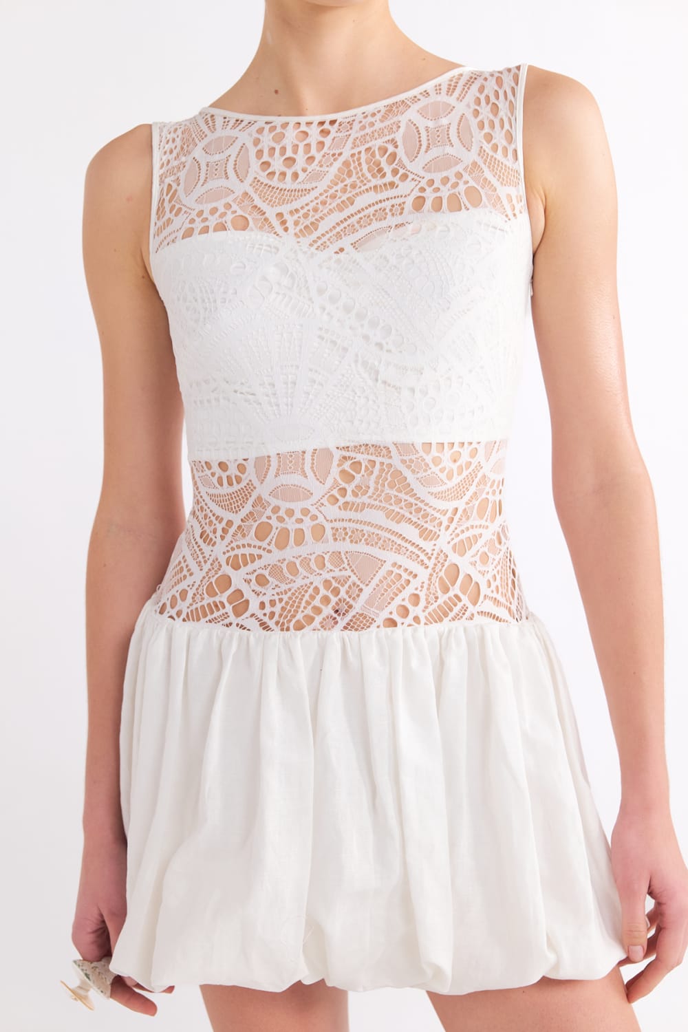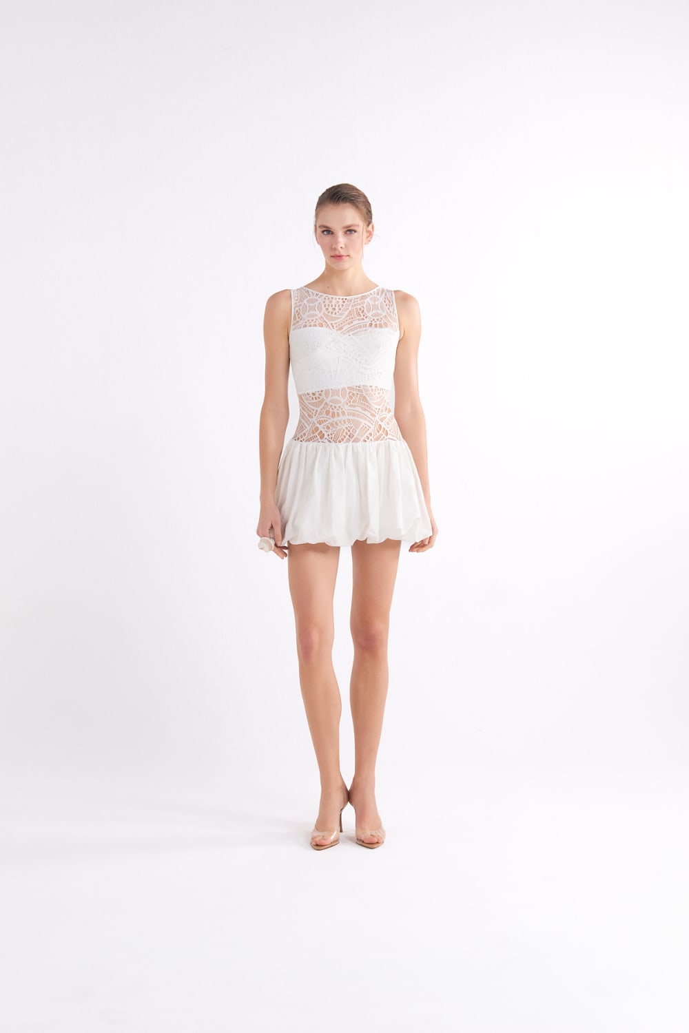 Dantel üst detaylı beyaz mini elbise ve balon etek.