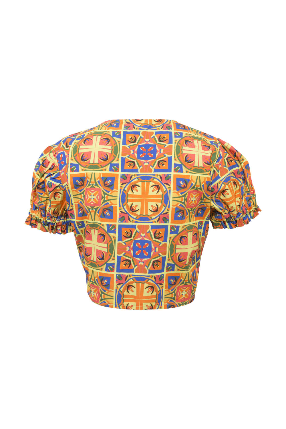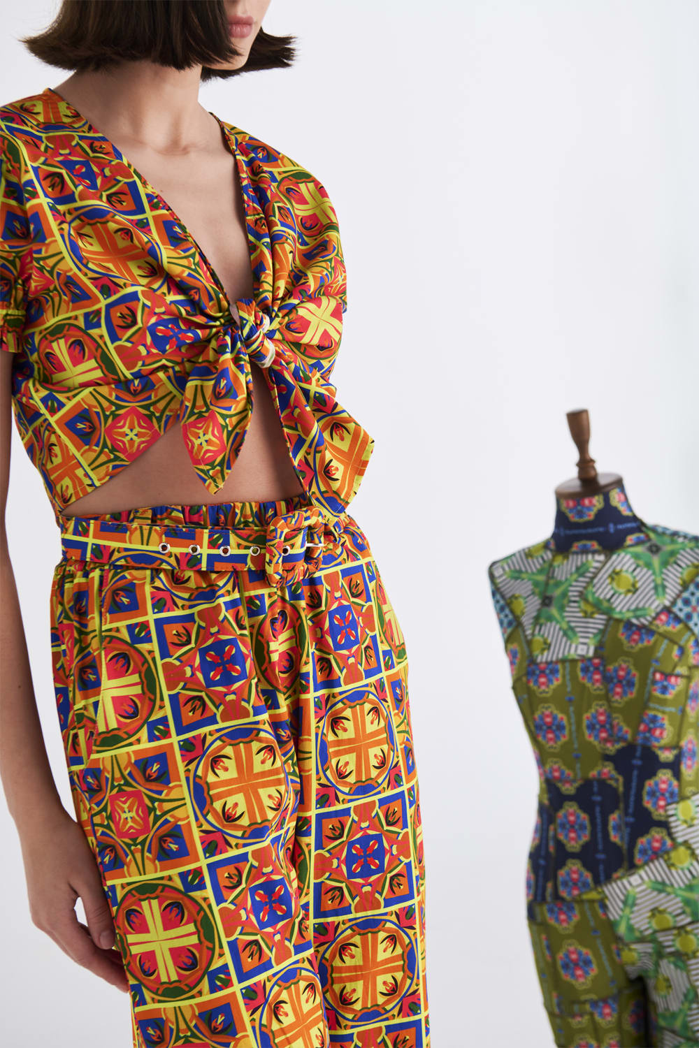 Desenler, Sanatçı Defne Camcıoğlu’nun eserlerinden oluşturulmuştur,%100 Pamuk,Ürün dayanıklılık ve konfor gözetilerek, ince dokulu ve tok duruşlu poplin kumaş ile özenle tasarlanmıştır,Geometrik desenlerden oluşan eser, poplin kumaş'a dijital baskı yöntemi ile basılmıştır,Ürün crop, kısa ve karpuz kol detaylıdır,V yaka olan ürün, önden bağlama detayı ile şık bir görünüm sunmaktadır.BAKIM ÖNERİLERİ:30 derecede yıkama yapılabilir,Ağartıcı kullanılamaz,Makinede kurutmayınız.Boy:40 cmEn: 100 cm