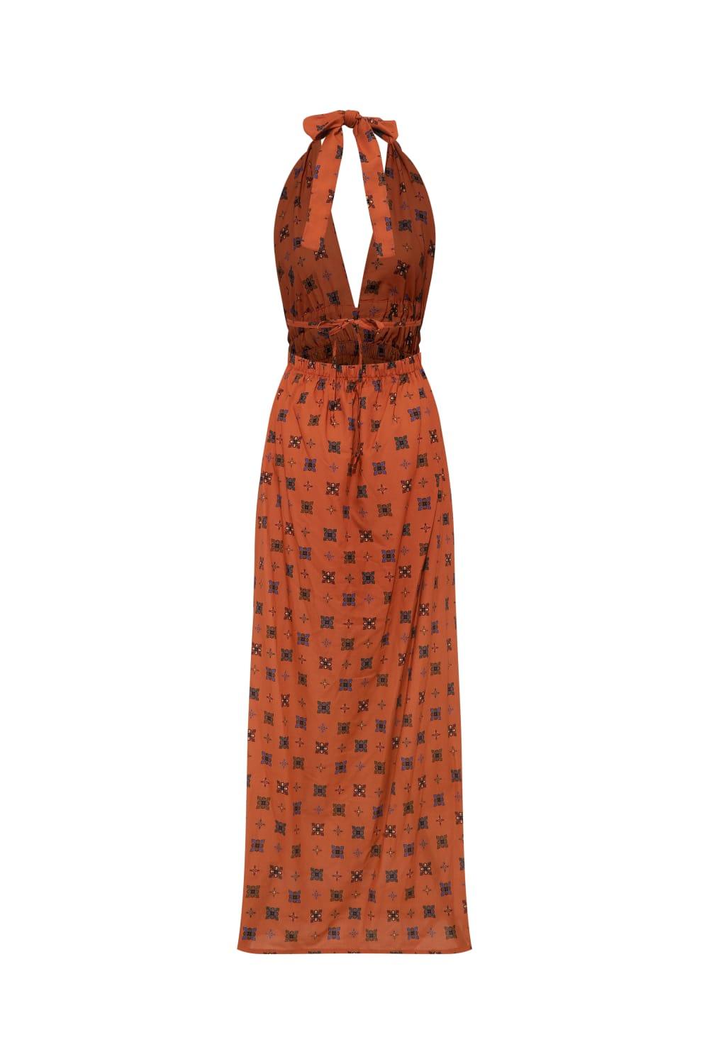 Boyfriend Desenli Boyundan Bağlamalı Uzun Elbise