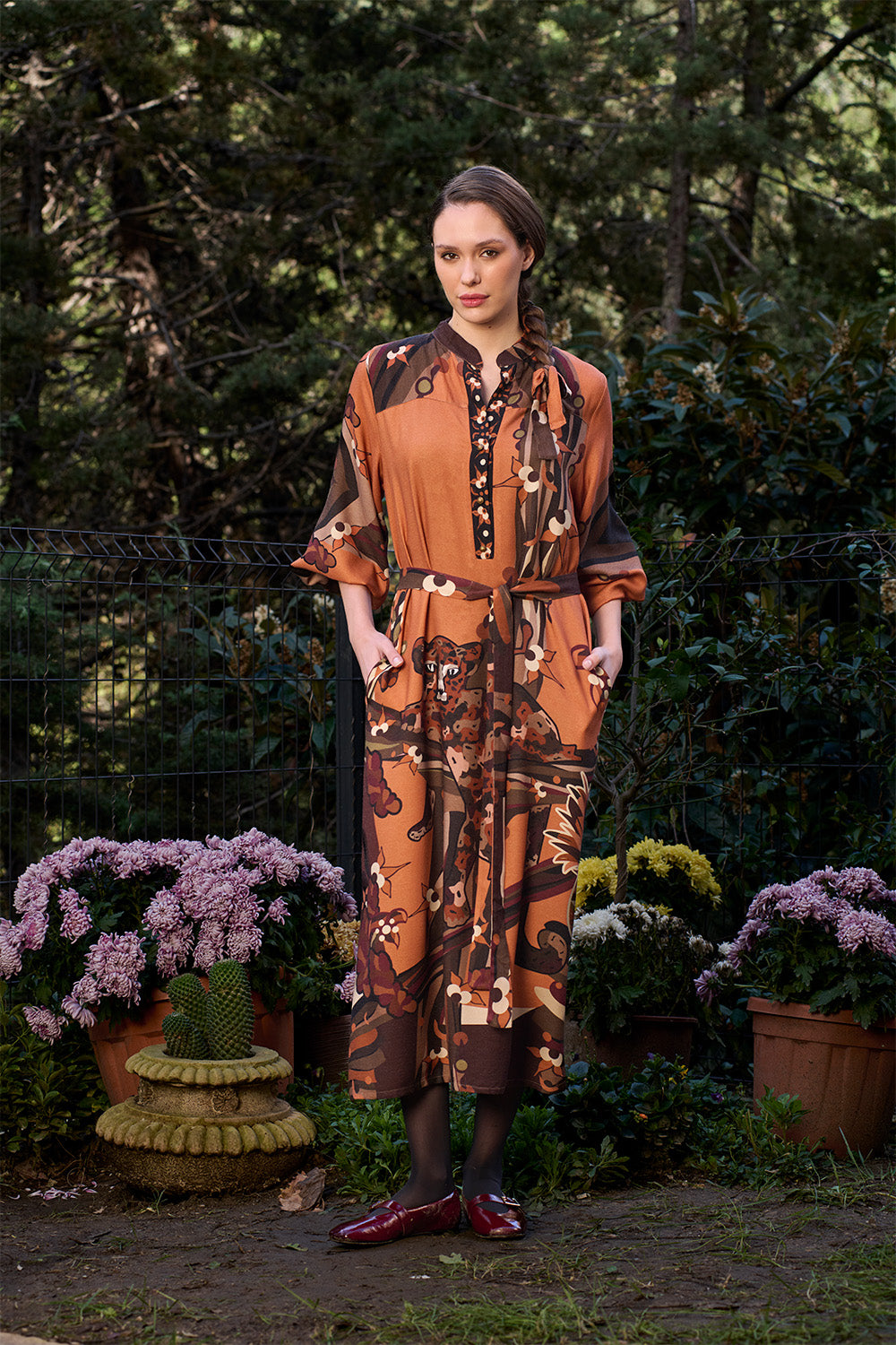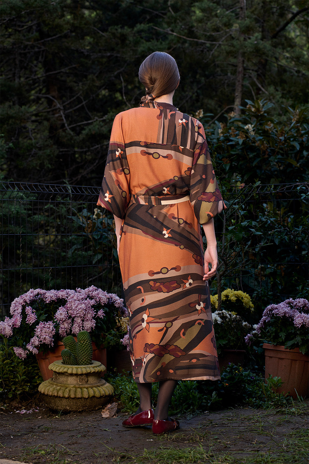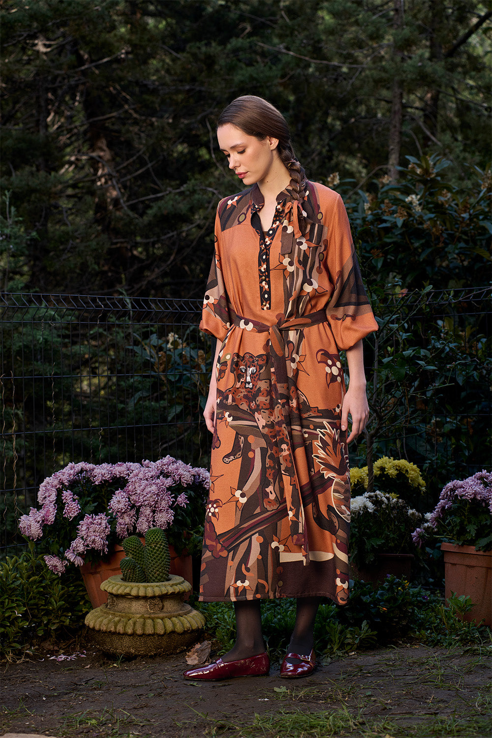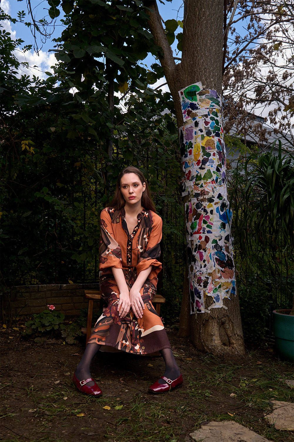 Desenler sanatçı Defne Camcıoğlu'nun resimlerden oluşmuştur,%100 viskon içeriklidir, dokuma türü twilldir.Desenler dijital baskı yöntemi ile basılmıştır,Ürünler özel ve detaylı bir ölçü çalışması ile birleştirilmiş beden olarak üretilmiştir; S/M: 36-38 M/L: 38-40 bedenlerini karşılamaktadır,Hakim yaka olan elbise cep ve kuşak detayı ile bir çok okazyona uyum sağlamaktadır.