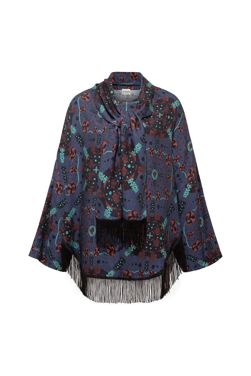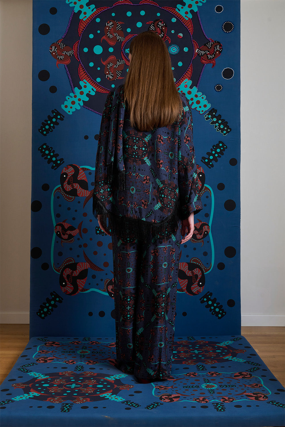 Desenler sanatçı Defne Camcıoğlu'nun resimlerden oluşmuştur,%100 viskon içeriklidir, dokuma türü twilldir.Desenler dijital baskı yöntemi ile basılmıştır,Ürün standart kalıp sebebi ile tek beden olarak belirlenmiştir,bir çok forma uyum sağlamaktadır,Gömlek yaka ve fular detaylı bluz fular ucunda saçak detayı ile şık bir görünüm sunmaktadır.