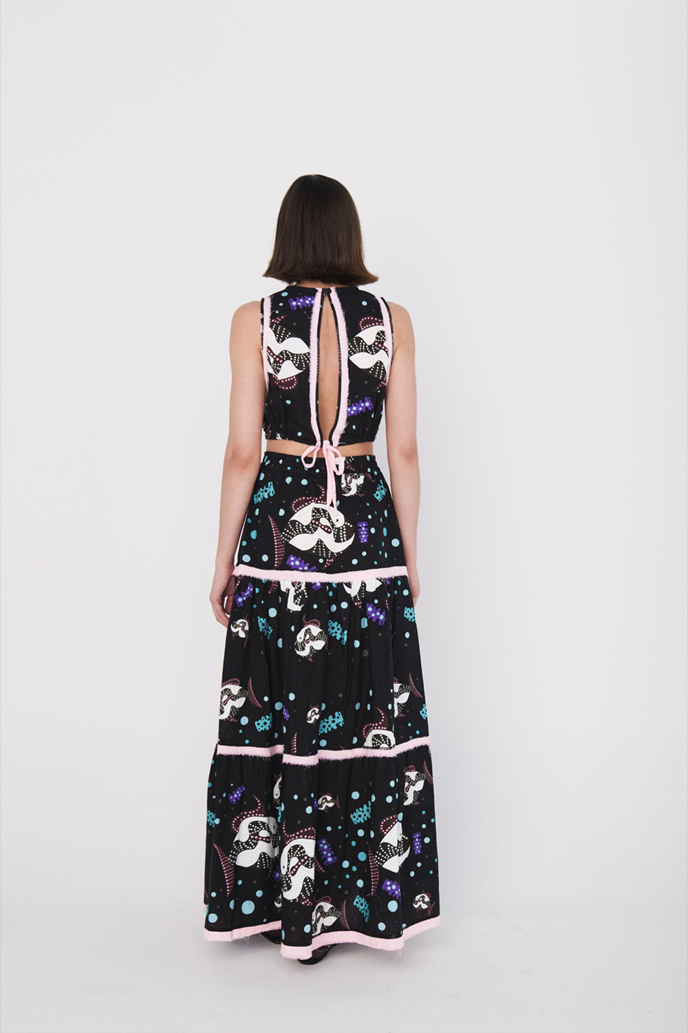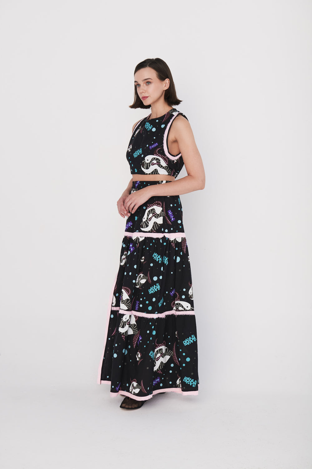 Siyah Balık Desenli Kat Detaylı Önden Yırtmaçlı Uzun Etek