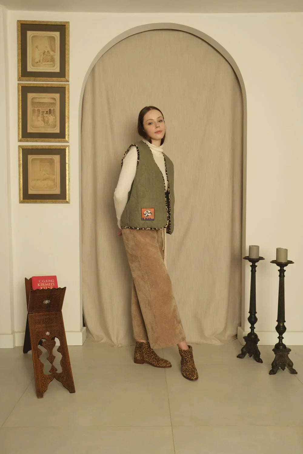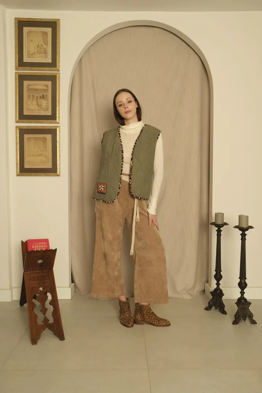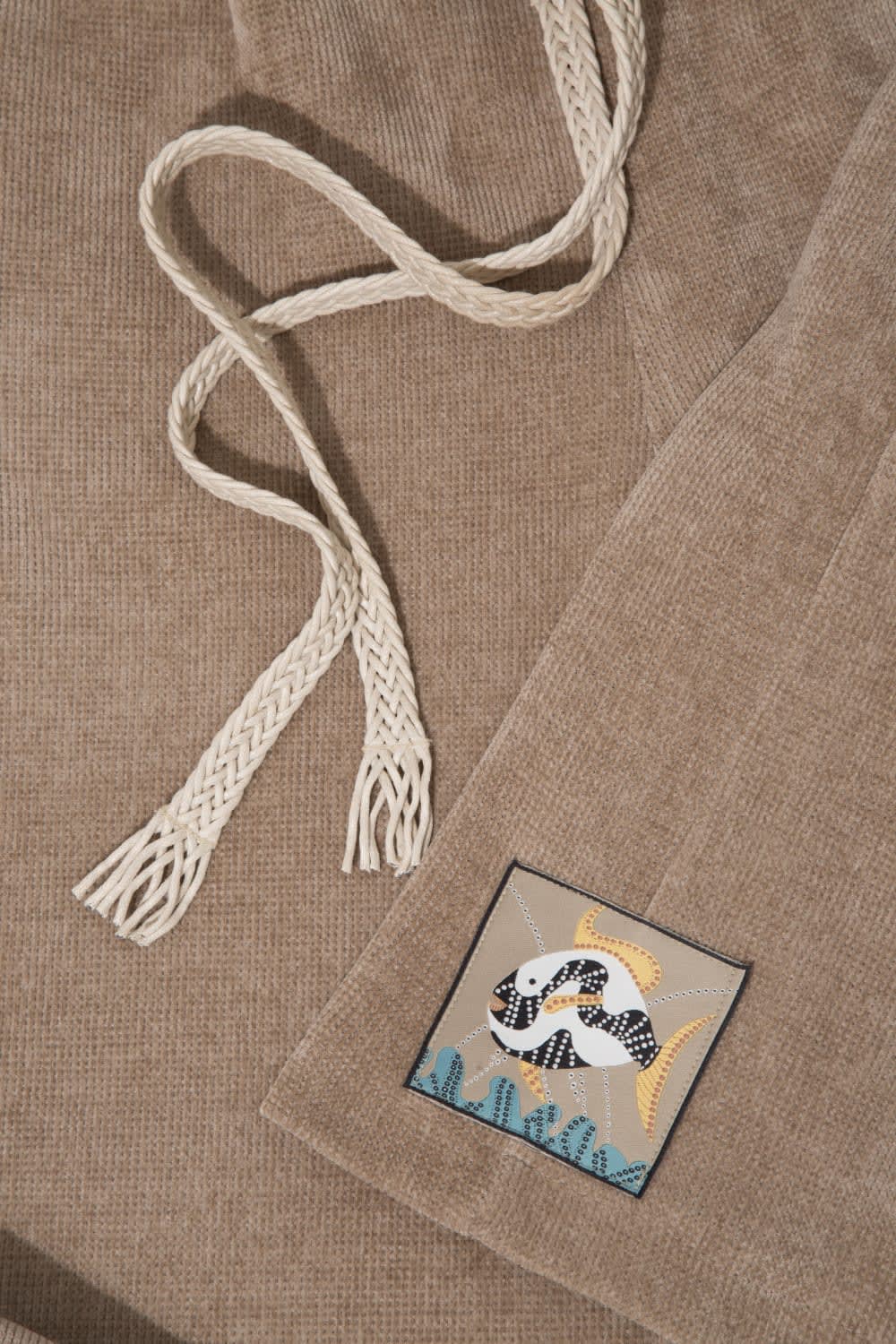 Şönil Bej Kemer Detaylı PantolonBalık desenli etiket detayı sanatçı Defne Camcıoğlu’nun eserlerinden oluşturulmuştur,%94 polyester %5 elastan içeriklidir,Ürün, yumuşak dokulu şönil kumaştan üretilmiştir,Yüksek bel, bol paça ve beli lastikli olan ürün desenli kemer birleşimi ile şık bir görünüm sunmkatadır.Standart beden olan ürünün ölçüleri BEL:64 cm BEL:97 cm şeklindedir.BAKIM ÖNERİLERİ:30 derecede yıkama yapılabilir,Ağartıcı kullanılamaz,Makinede kurutmayınız.