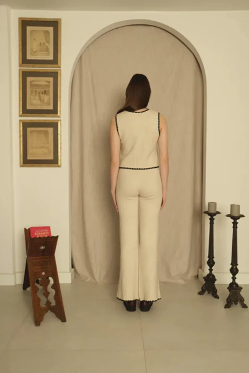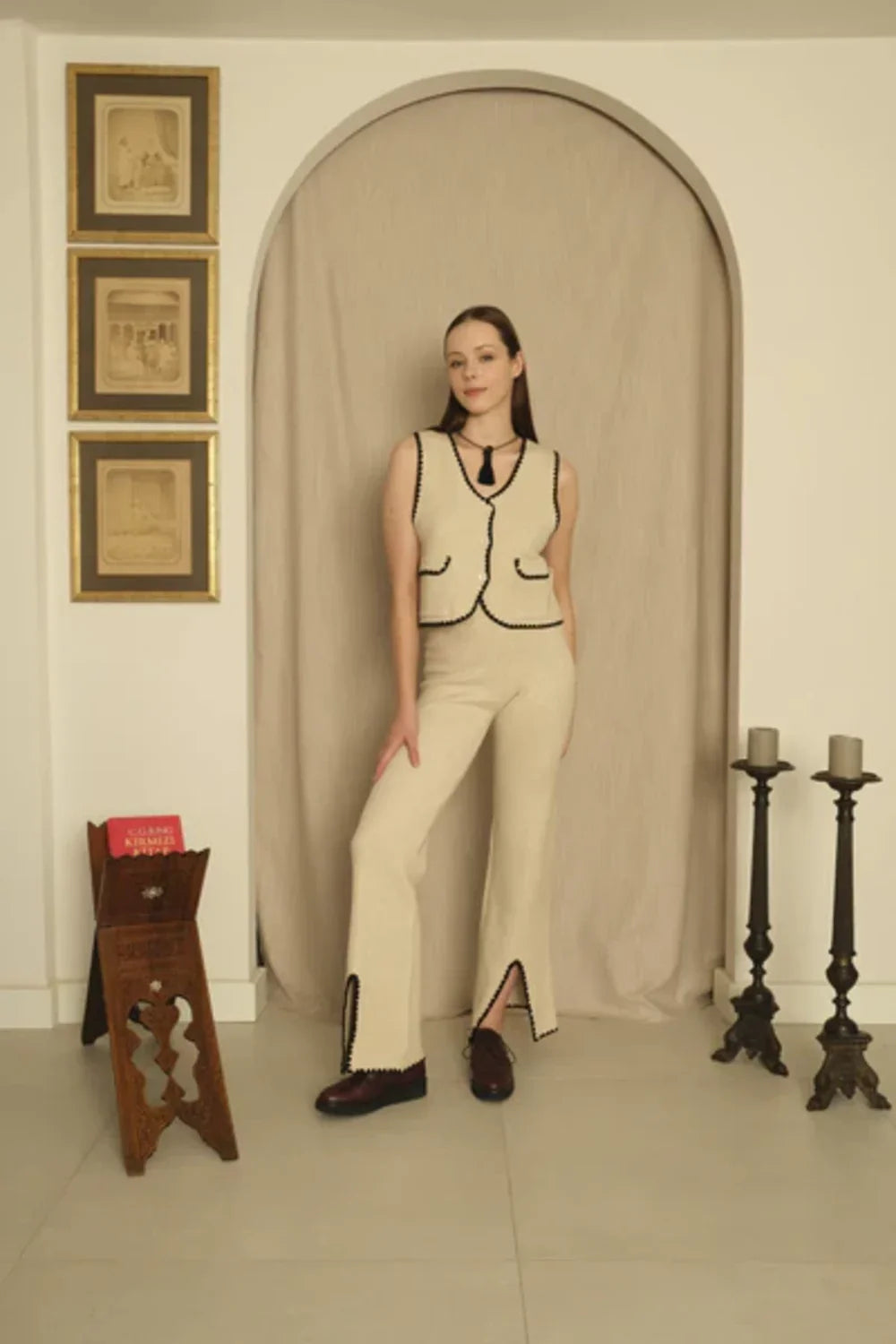 Triko Ekru Siyah Sıçandiş Nakışlı Yelek